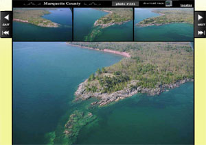 The Great Lakes Shoreviewer provides professional color photography of every inch of coastline (and many islands) in the Upper Peninsula of Michigan (Lake Superior, Lake Michigan and Lake Huron). Each coastline photo also has a series of maps showing important natural features for planning and protection efforts.