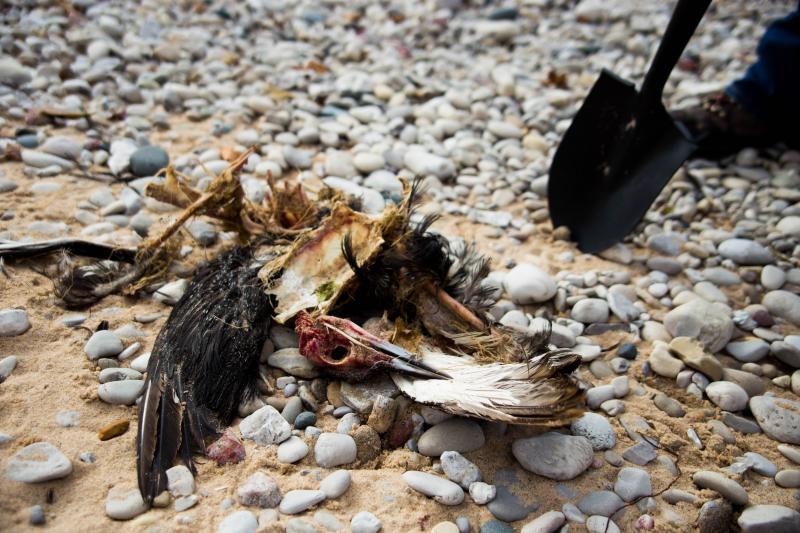 Standing over a carcass, he says, “OK, so we have a long-tailed duck and we’re going to pick that up away from the shoreline, take it up into the foredune and then we dig a hole two feet deep and bury it so it’s away from park visitors and pets and no longer a threat to public health.”
