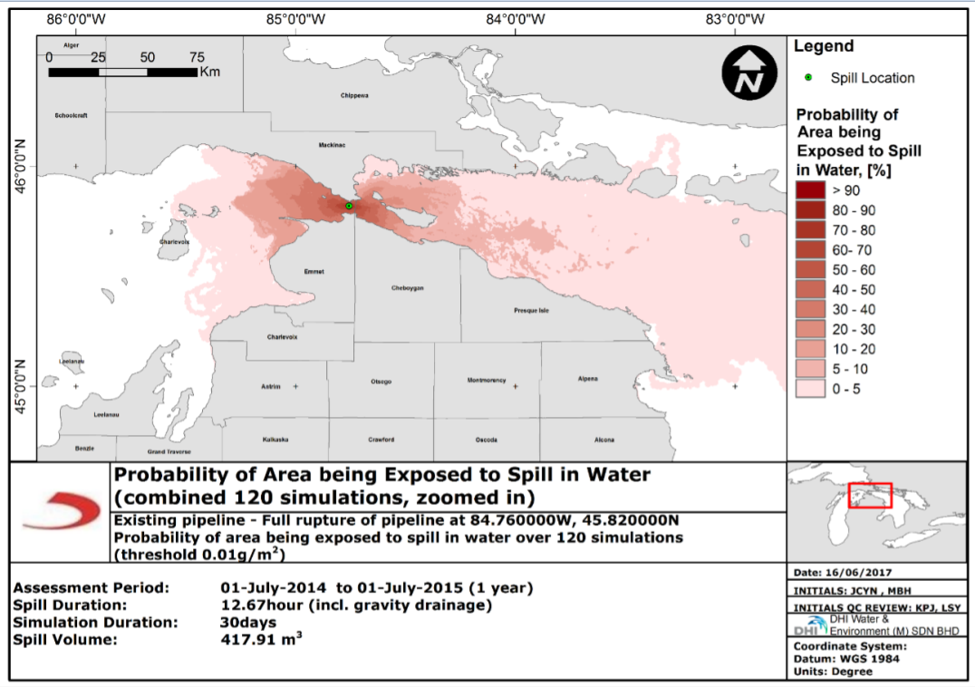According to the analysis of more than 4,300 spill simulations, a rupture to both Straits pipelines – with concurrent failures of primary valves on each pipeline and secondary safety valves – could release up to 58,000 barrels of crude oil into the Great Lakes and impact more than 400 miles of shoreline in Michigan, Wisconsin and Canada based on wind and current conditions.