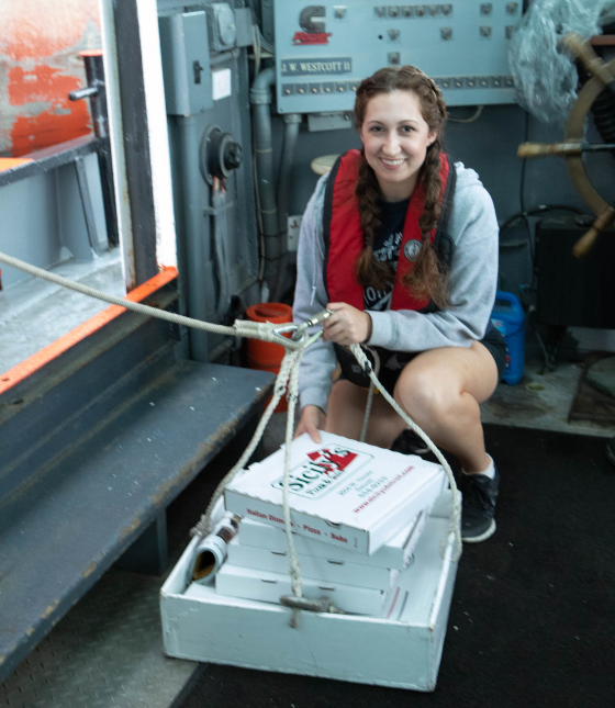 Deckhand & dispatcher Jessica Chuba prepares pizza delivery, Photo by Robert Hensleigh via Glen Mannisto