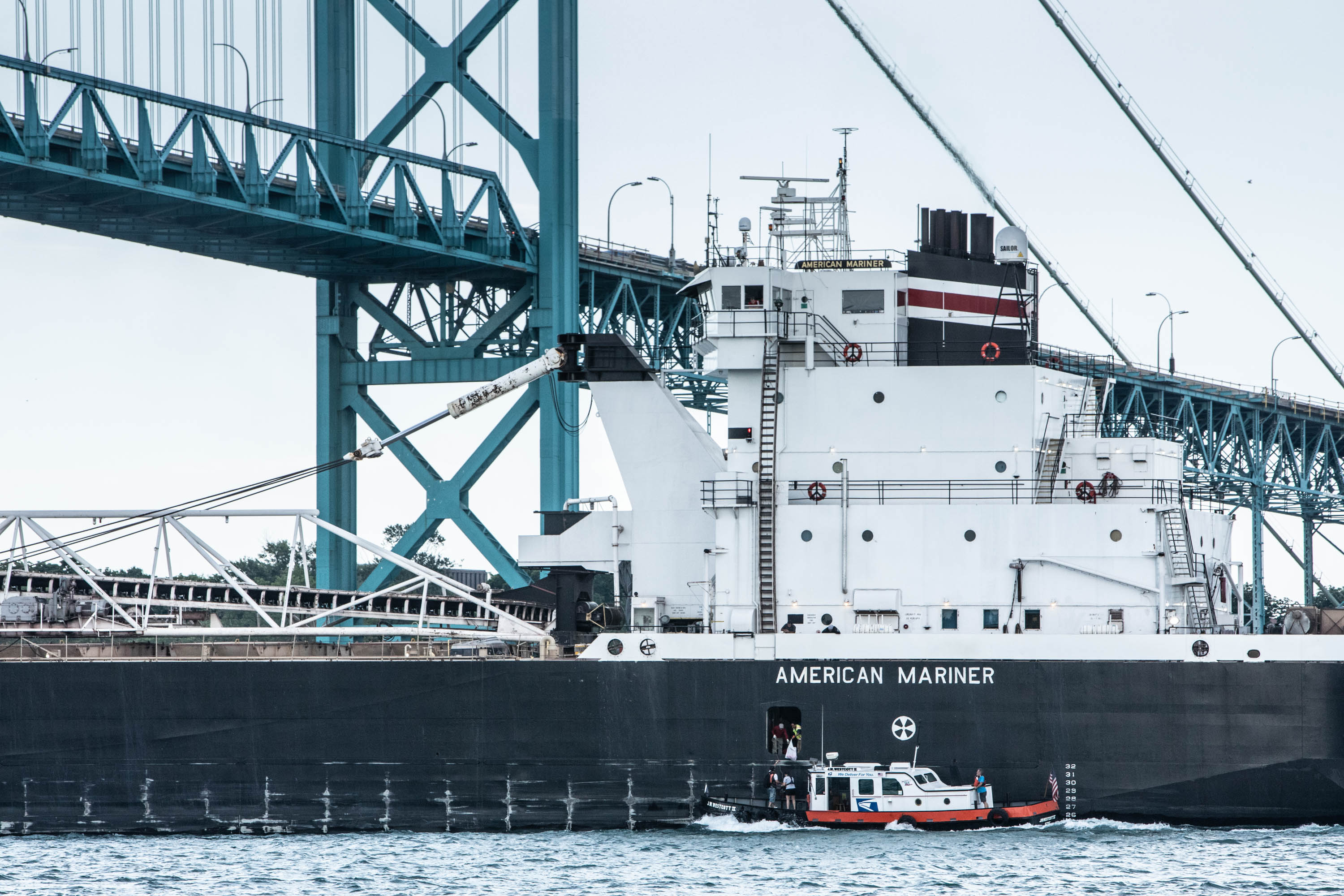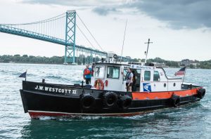Of course, the auto industry had stimulated much of the river’s shipping commerce but even before the advent of that, in 1874, John Ward Westcott had started rowing a small boat out to passing ships which were carrying timber, grain, and coal to deliver supplies via rope and bucket.