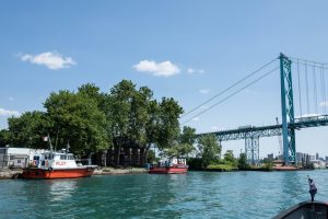 The Detroit Ambassador Bridge’s graceful arc over the blue water of the Detroit River conceals in its shadows three workboats. Each boat plays an essential role in the everyday life of the river and all three go mostly unnoticed in their daily routine. They are moored, stern to bow, in a row, close together, each in its own way, ready: the Detroit Fire Department’s 75 foot, Curtis Randolph fireboat; the Lake Pilot Association’s 50’ Huron Belle; and the 48’ J.W. Westcott ll mailboat, the only floating zip code (48222) in the United States