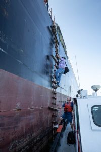 J.W. Wesctott ll’s deckhand Brian Heikkuri aiding pilot in pilot exchange on the Cypriot ship Isolda, Photo by Robert Hensleigh via Glen Mannisto