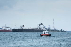 Moored near the Randolph is the Huron Belle which has the risky and strangely archaic task of shuttling pilots to foreign vessels– ships flying foreign flags from all over the world– that deliver and pick up cargo at Great Lakes ports. Foreign vessels must be piloted by a licensed pilot who is familiar with local navigation. It is an awesome, somewhat frightening process to watch a pilot climbing the vertical sides of salties (foreign ships) on Jacob’s ladder in order to assume control.