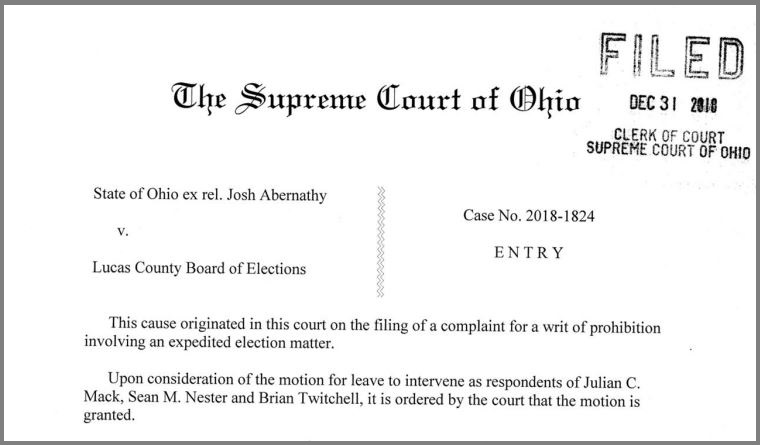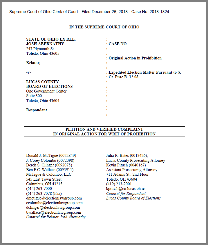 Although the Lucas County Board of Elections in a 3-0 vote approved the ballot initiative last month, a second protest filed the day after Christmas on behalf of Josh Abernathy is before the Ohio Supreme Court and could, ultimately, prevent the grassroots initiative from appearing on the ballot. Abernathy is a Toledo-area trades union member who is represented by Columbus-based attorney Don McTigue.