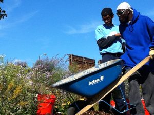 Volunteers working the urban garden along the Dequindre Cut, Photo courtesy of the Detroit Garden Center via John Hartig