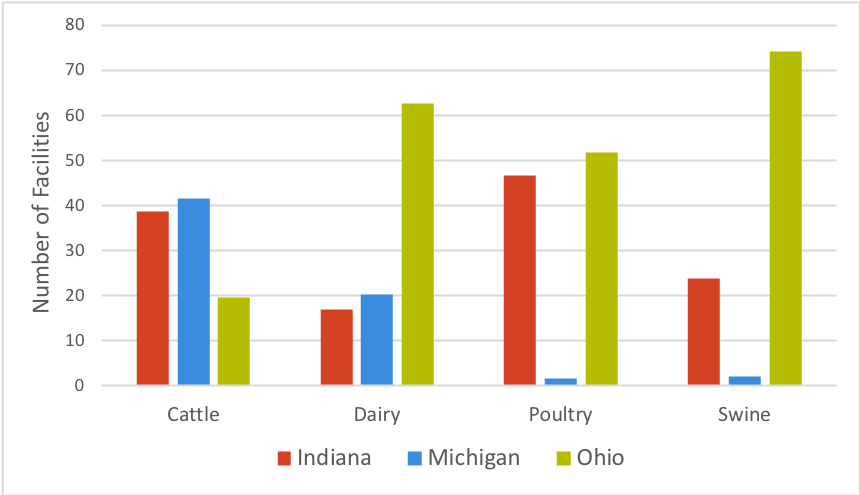 Indiana doesn’t rely on the federal numbers in determining if a farm needs permitting. Officials there set their own rules, regulating operations with 300 or more cattle, 600 or more swine and 30,000 or more poultry – far below the thresholds Michigan and Ohio use.