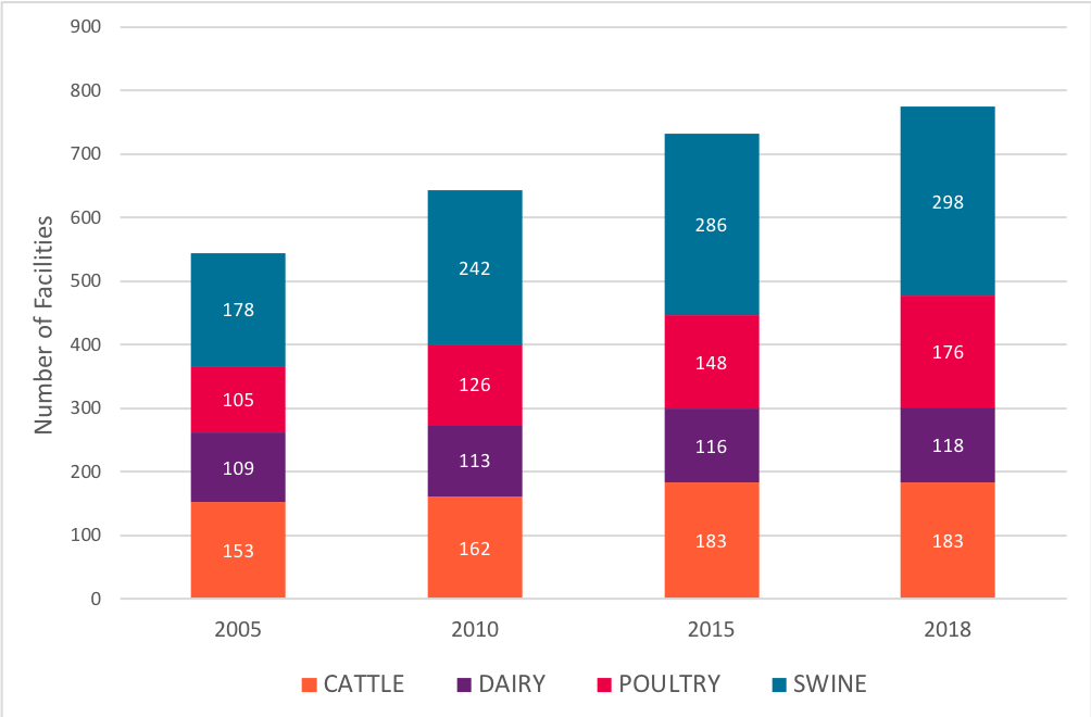 The study includes an interactive map illustrating the size and location of CAFOs and also the number operating in 2005 versus 2018.