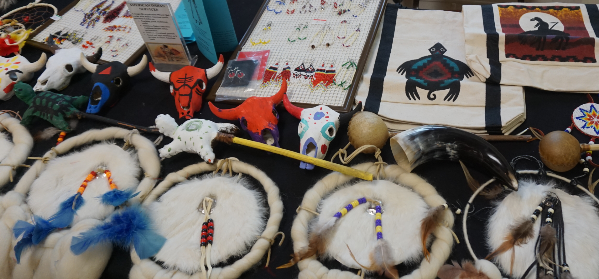 In one corner of the Standing Rock photo exhibit, a row of tables features artwork from American Indian Services and their youth program. Adjacent is a display of necklaces and beadwork made by elder members of the North American Indian Association of Detroit. At the far end, behind displays of his sister’s beaded Christmas ornaments and daughter’s hand-made earrings, sits Warren Petoskey.