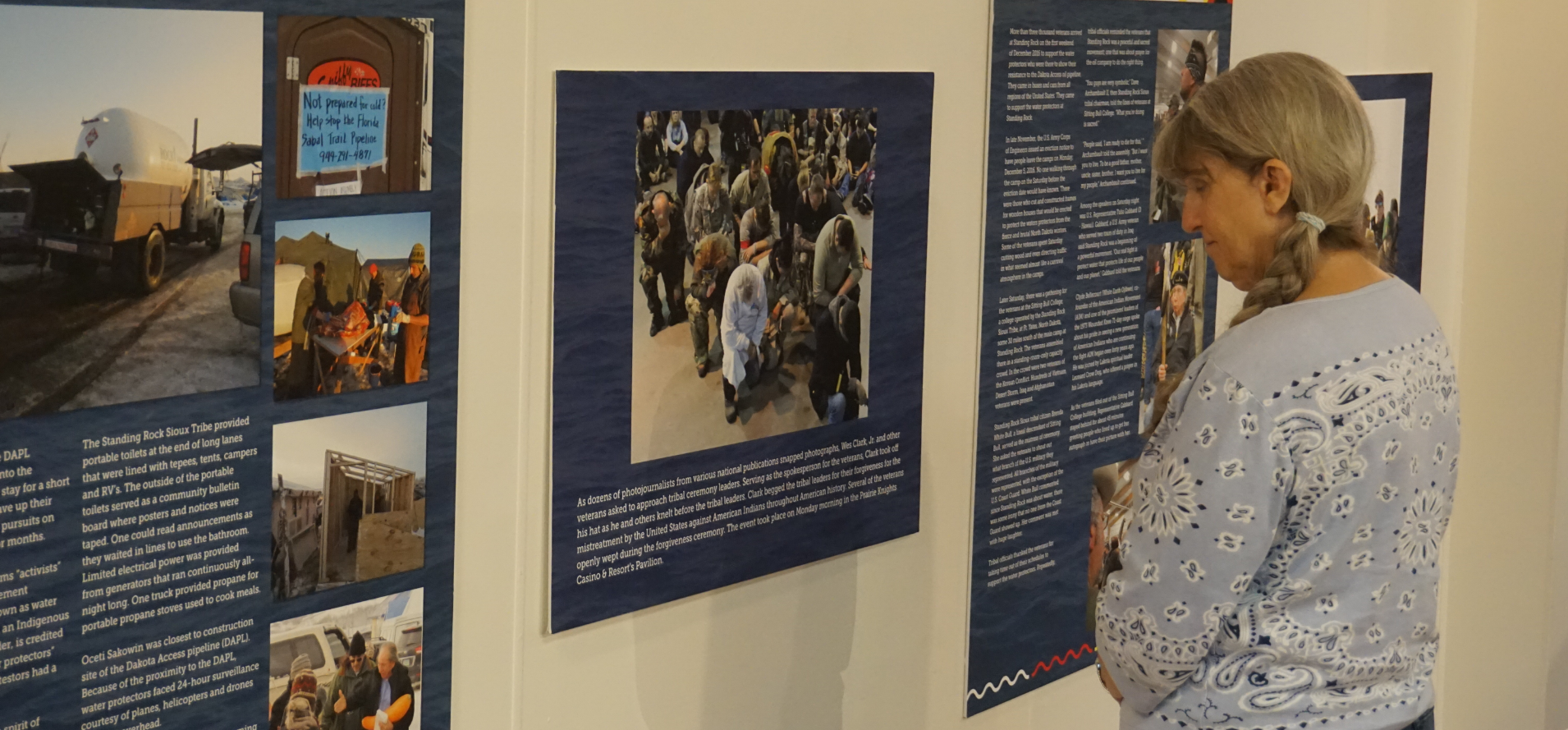 The exhibit runs through June 4, with free parking and admittance for visitors, and is split between the entrance level containing the Standing Rock photo exhibit and a lower level displaying artwork by and of local Native Americans.