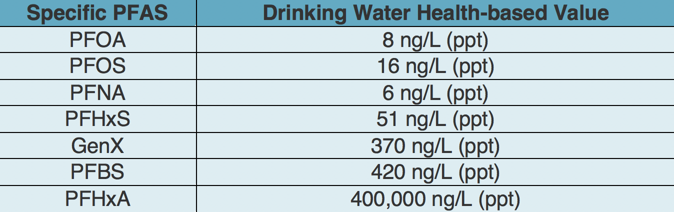 The EPA currently has health advisories of 70 parts per trillion for two of the chemicals—PFOA and PFOS. The MPART health-based values put PFOA at 8 ppt and PFOS at 16 ppt.