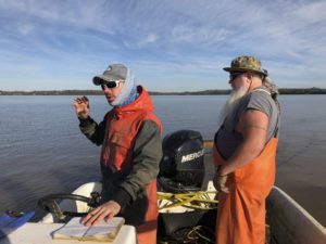 Matt Balazik, a sturgeon research ecologist with Virginia Commonwealth University and the U.S. Army Corps of Engineers, and his brother, Martin Balazik, a volunteer with VCU’s Rice Rivers Center, set out to catch baby Atlantic sturgeon on Virginia’s James River. Dec. 29, 2018. (AP Photo/Ben Finley)
