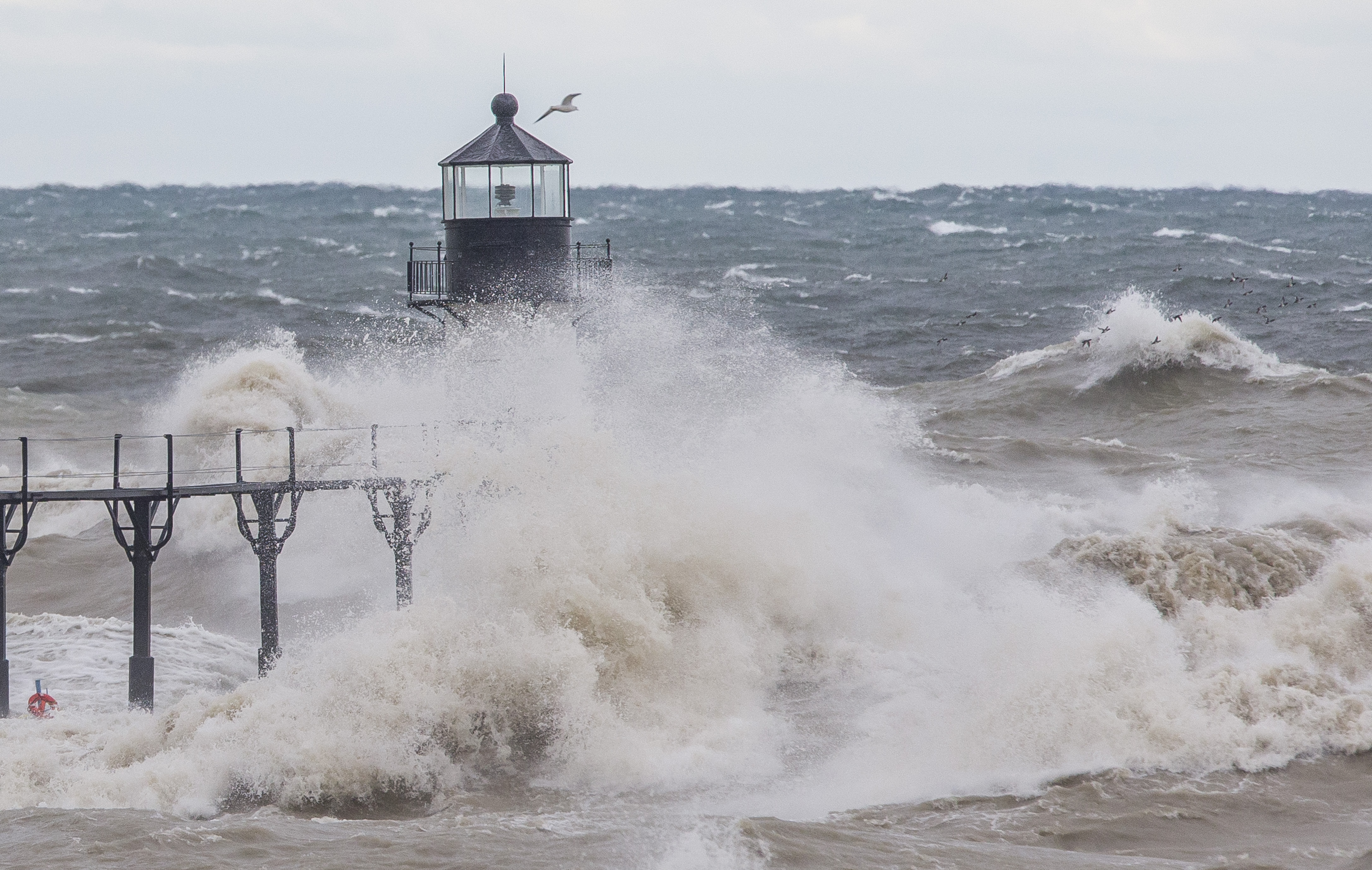 Featured image: Large waves, on Lake Michigan, caused by high winds, crash into the Saint Joseph Lighthouse and pier on Wednesday, Oct. 16, 2019, in Saint Joseph, Mich. (Robert Franklin/South Bend Tribune via AP)