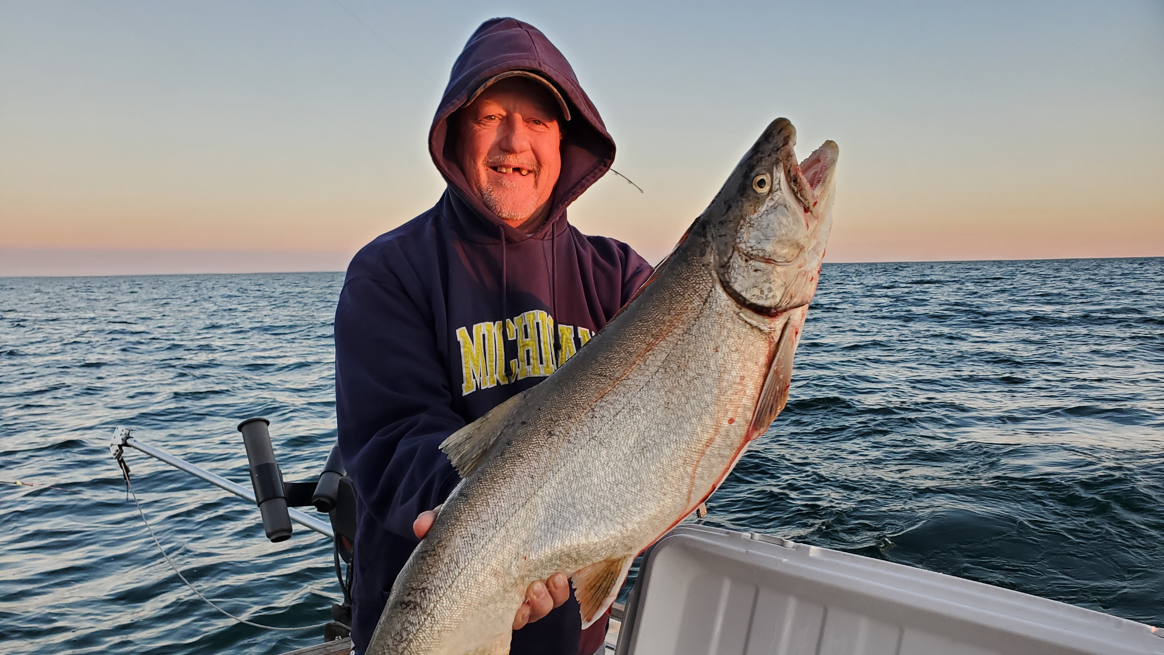 Featured Image: Kim Altenbernt holds up his Lake Michigan lake trout catch on July 12, 2019, Photo courtesy of Ed Blissick