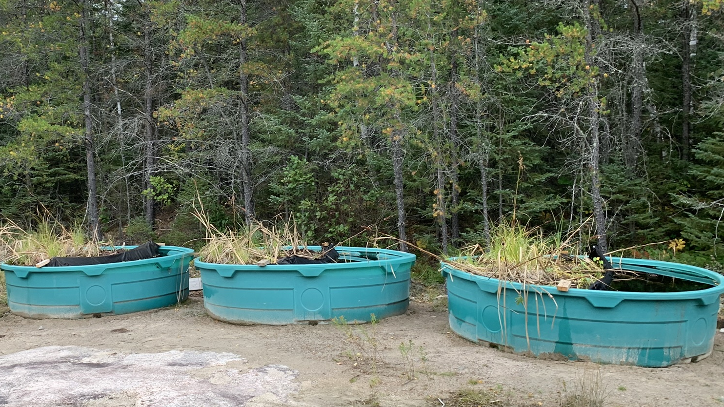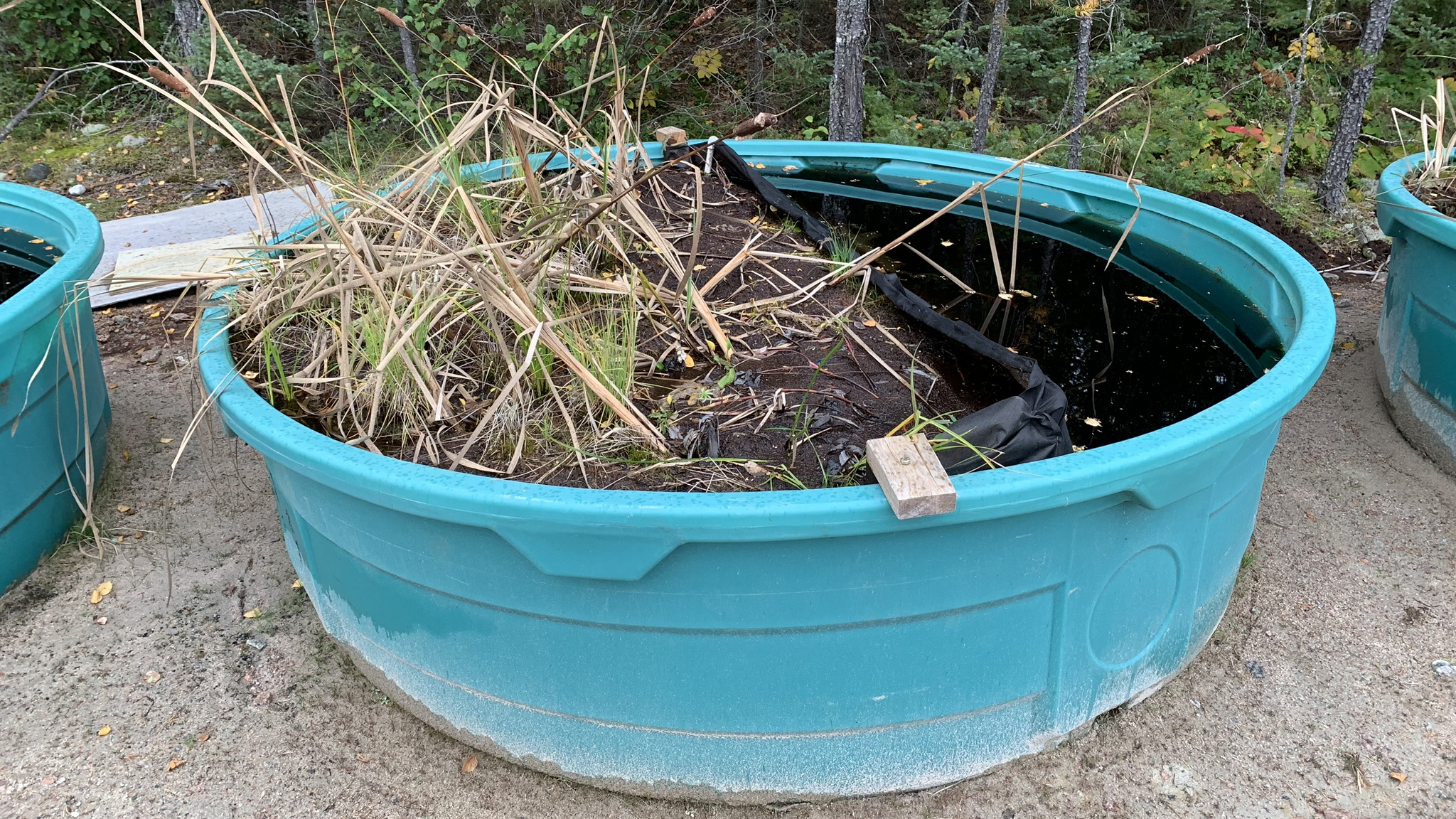 The first stage of their research involved creating model wetlands in the Experimental Lakes Area using three open air plastic containers roughly the size of an eight-person hot tub. Each tub contains water from the nearby wetland, a small floating mat of soil and plants, plus native fish and invertebrates.