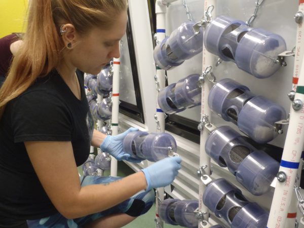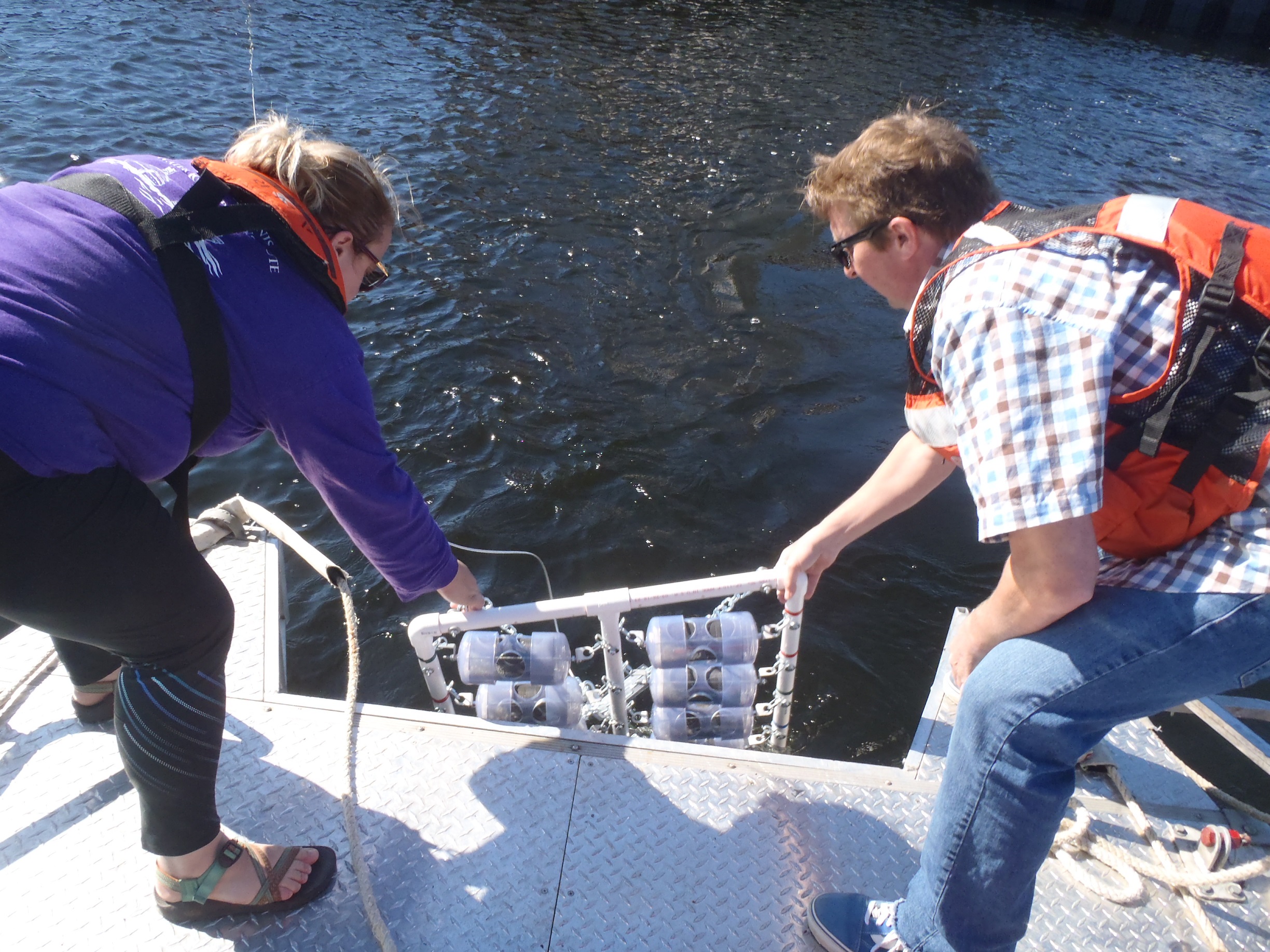 Rachel Orzechowski, a research assistant at AWRI, Grand Valley State University, sets up microplastics samples to submerge for 1-3 months in Muskegon Lake, Photo courtesy of John Scott