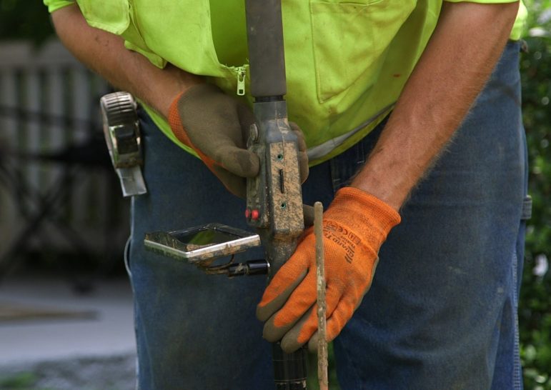 Featured Image: A PWSA contractor inserts a small camera into a curb box to identify the material of the service line below. (Photo by Ryan Loew/PublicSource)