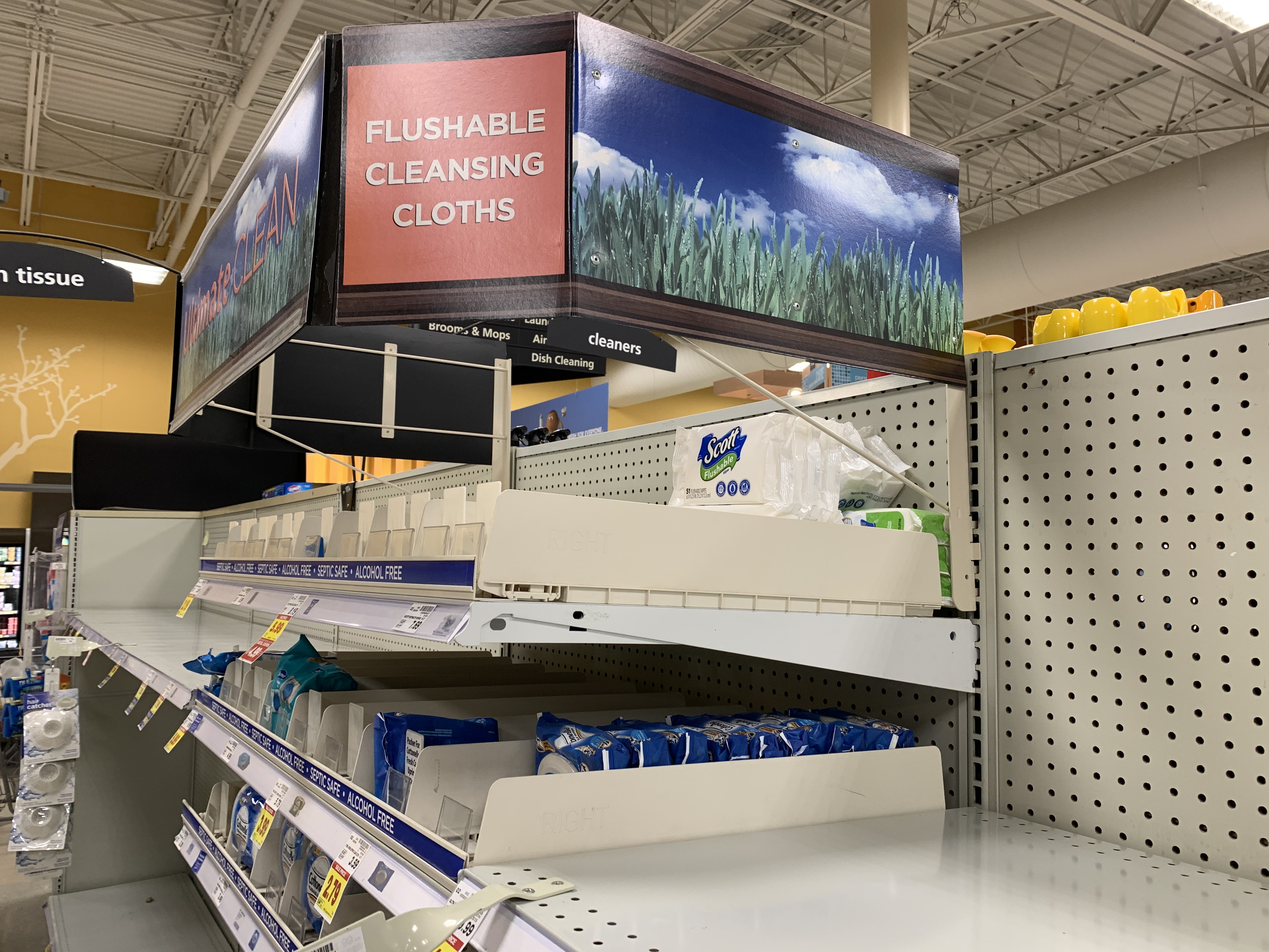 Shelves are wiped out in stores around the United States. Among the more popular items: toilet paper, hand sanitizer and wipes of all sorts—both disinfecting and flushable.