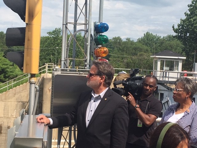 Sen. Gary Peters at Brandon Road Lock and Dam. (Photo by Gary Wilson)