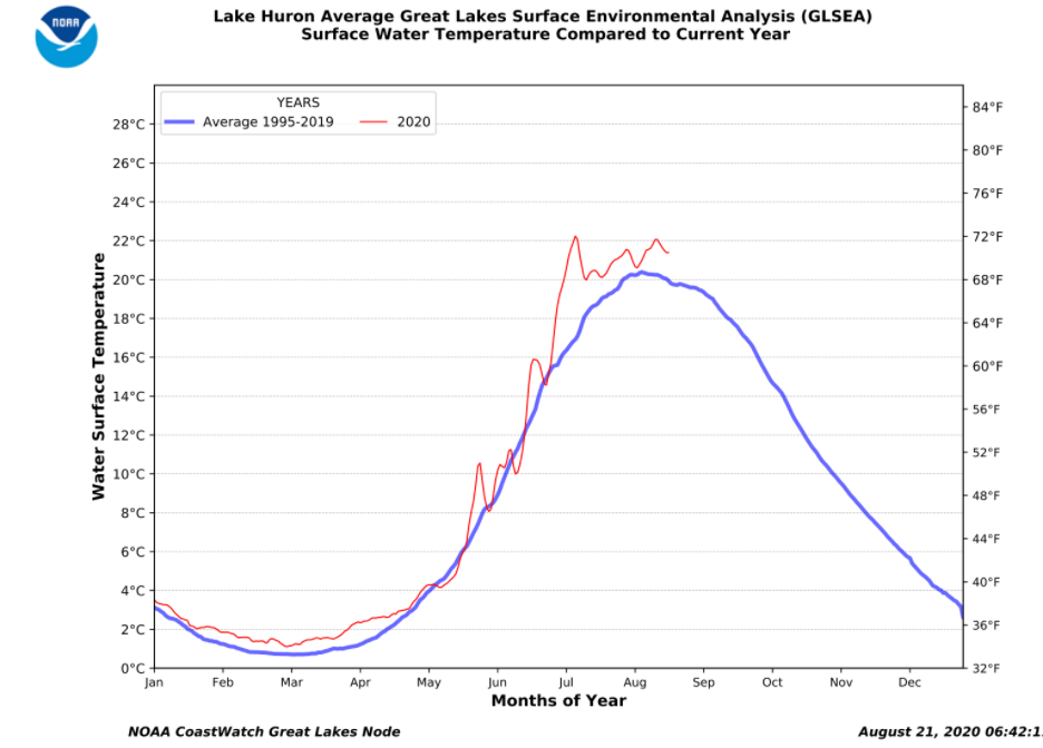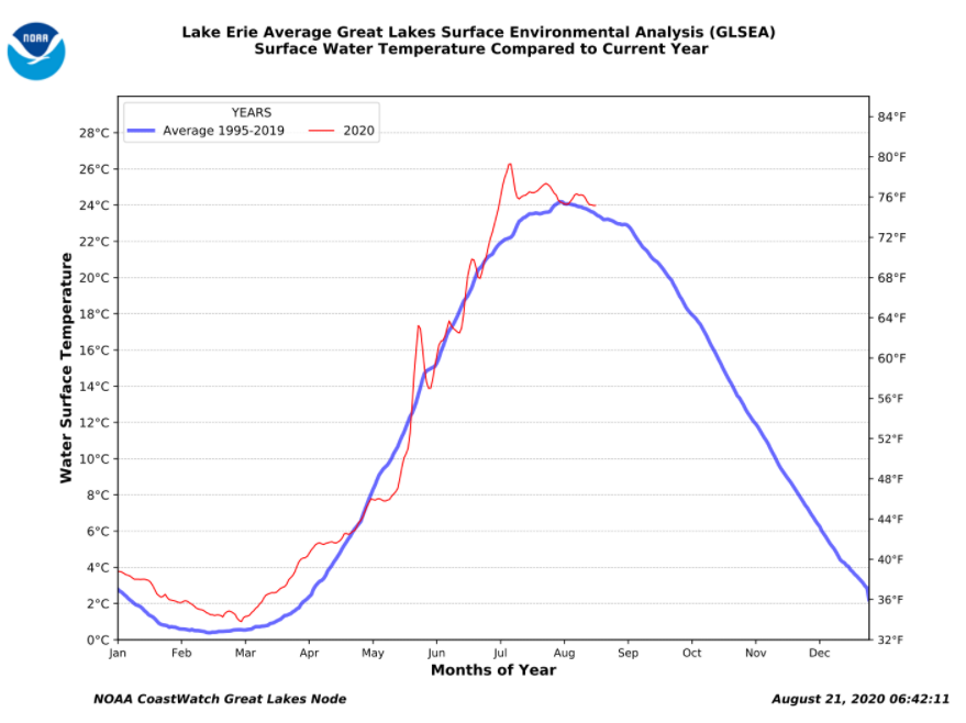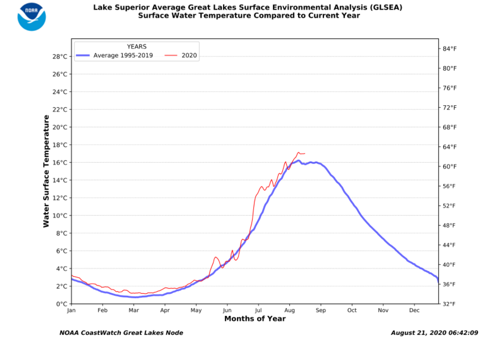 Whether the warming trend will hold remains to be seen. The temperatures generally cooled down a bit in early August, but have since risen as of Aug. 21. The lakes’ surface water temperatures could continue to stay above their 1995-2020 averages as we prepare for hotter than normal air temperatures throughout the rest of August and September.