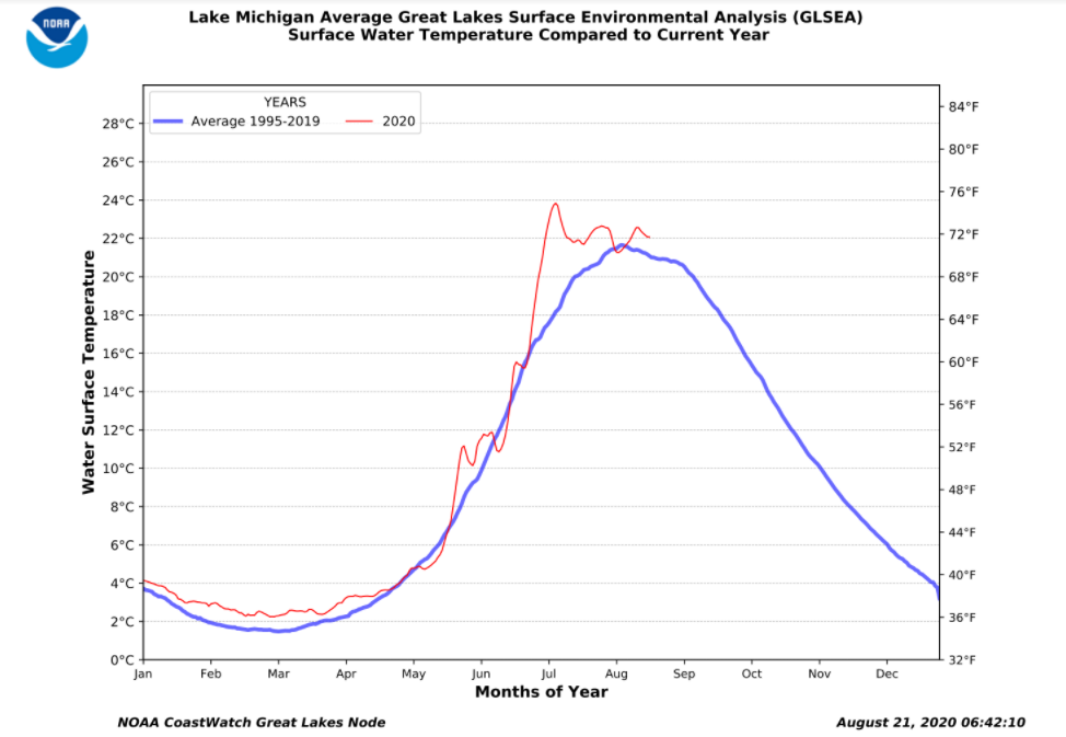 According to air temperature predictions made by NOAA Weather Service, above normal air temperatures during the rest of August and September could potentially translate to continued high surface temperatures in the Great Lakes for the rest of summer.
