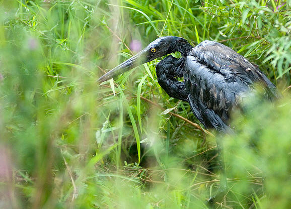 Featured image: Great blue heron covered in oil from the 2010 Enbridge oil spill near Marshall, Michigan. (Credit State of Michigan via Michigan Radio)