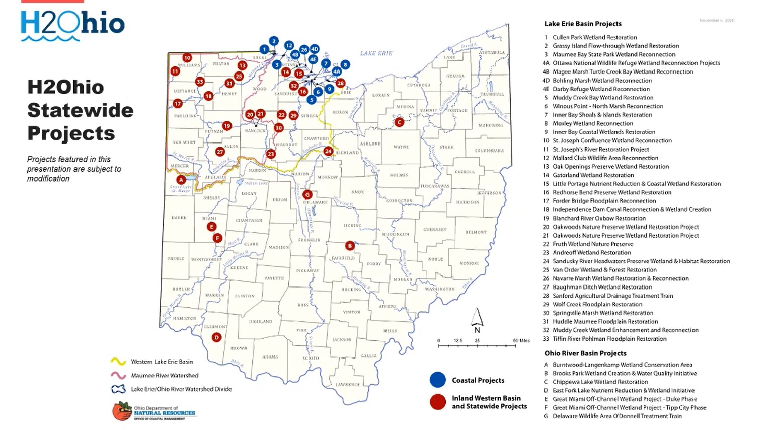 Of the 33 wetlands-related H2Ohio projects, 19 are concentrated on or near the western basin, while another 14 are upstream in the Maumee River watershed. According to Mertz, about 20 non-profit groups have partnered with the ODNR to help design and construct wetlands, most of which are not on state-owned land.