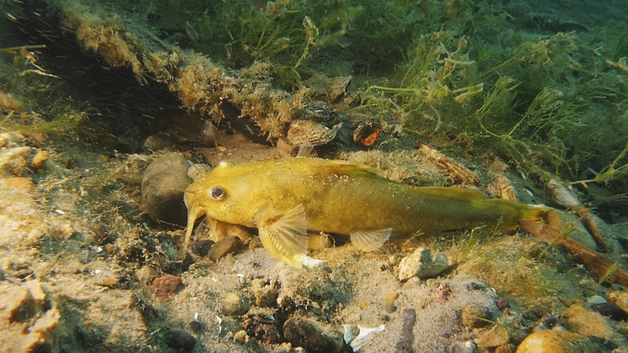 On this dive, he spotted the northern madtom under a log near the dig site and spent the remainder of his dive filming the little golden catfish.