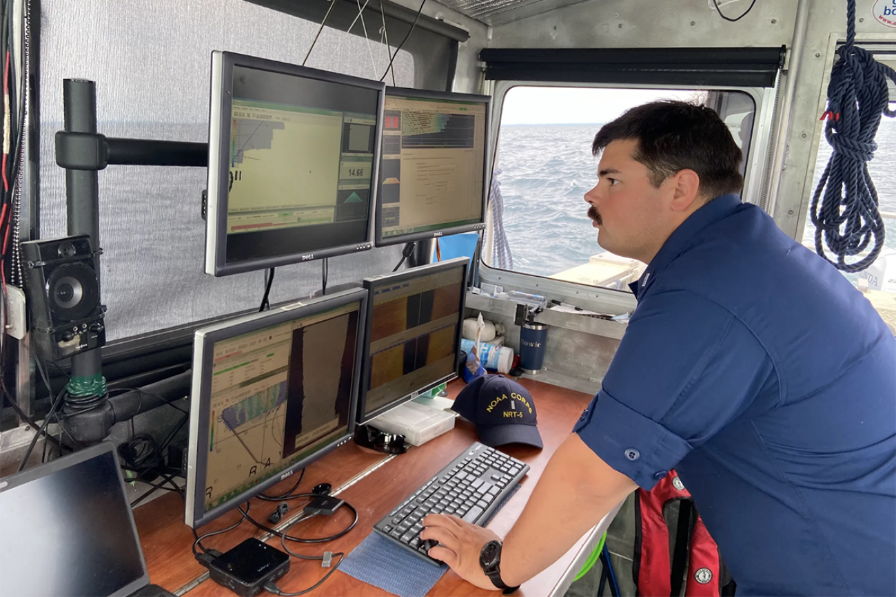 In Thunder Bay, NOAA crew members passed the monotonous hours offshore by listening to music or audiobooks, and scanning a bank of computer monitors for anything abnormal.