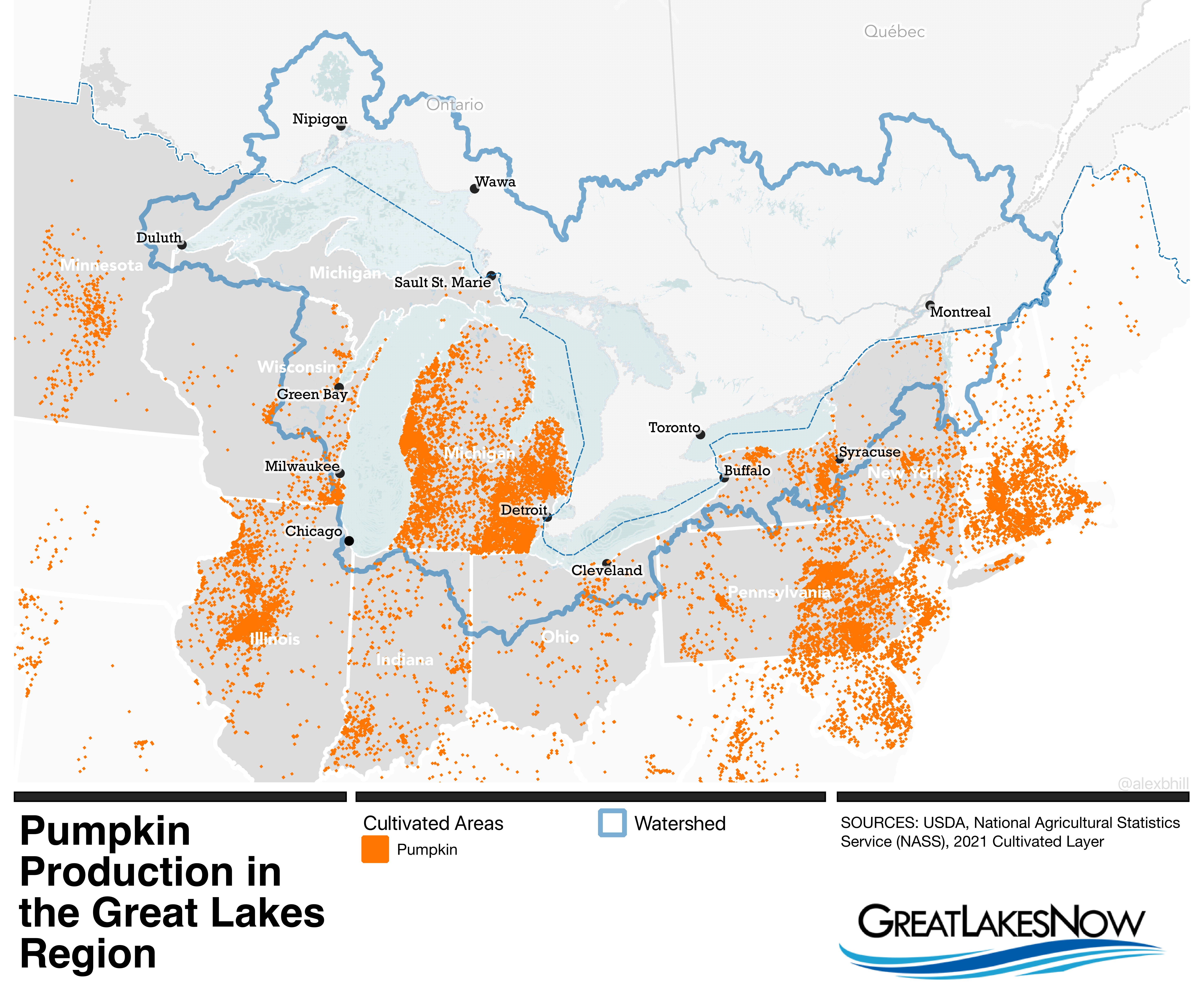 In this map of cultivated acres for pumpkins, there is a clear emphasis on pumpkin growing in Michigan even when hardly any of those pumpkins make it into production. Outside of the Great Lakes Watershed there are heavy pumpkin growing operations in central Illinois and eastern Pennsylvania. If you enjoyed a pumpkin pie for Thanksgiving, it was likely sourced from Illinois which harvests twice as many pumpkins as the other top producing states.