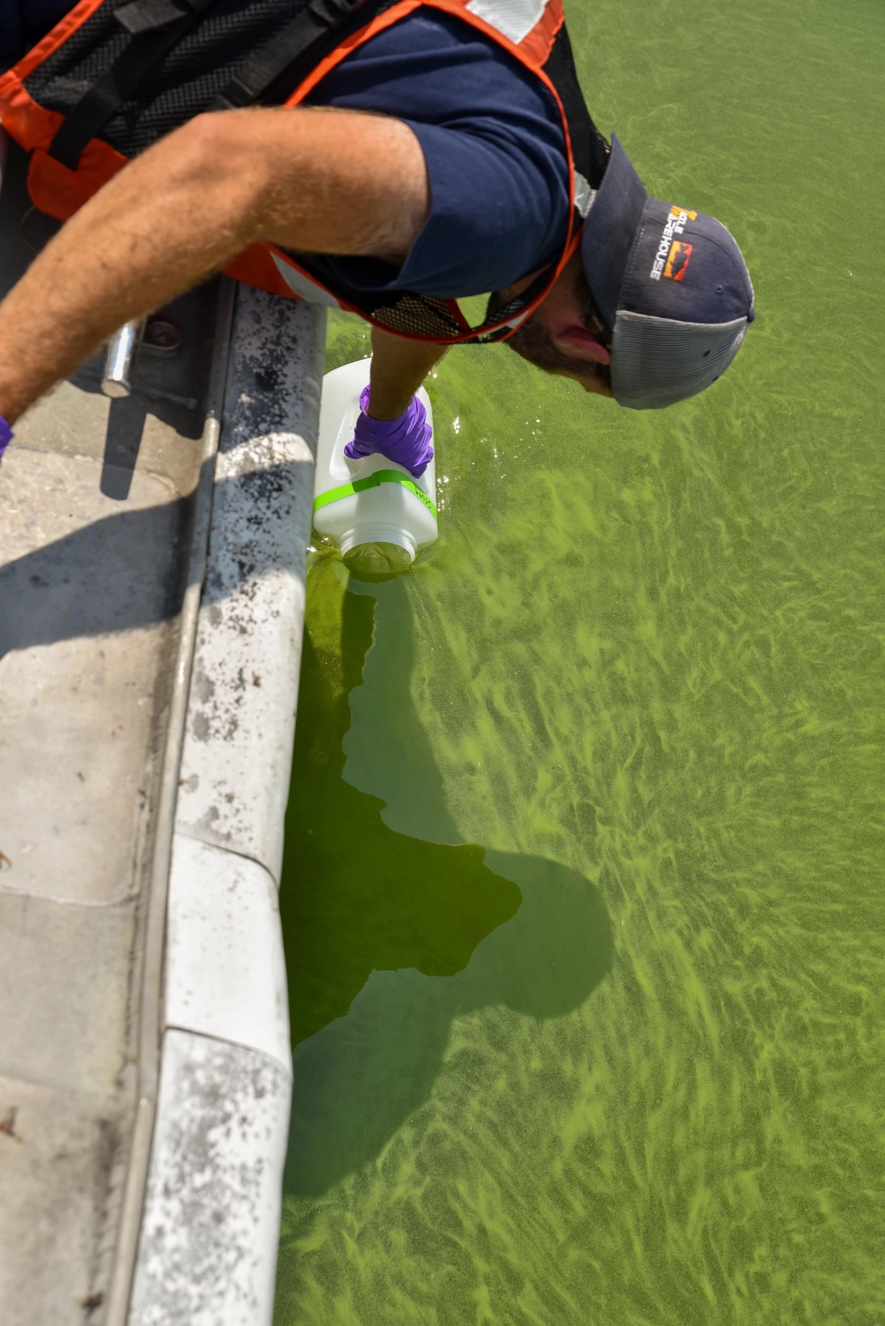 Watching from the research vessel, the crew spotted a boat towing an inner tube with people on it through the green soup of cyanobacterial blooms on Wednesday.