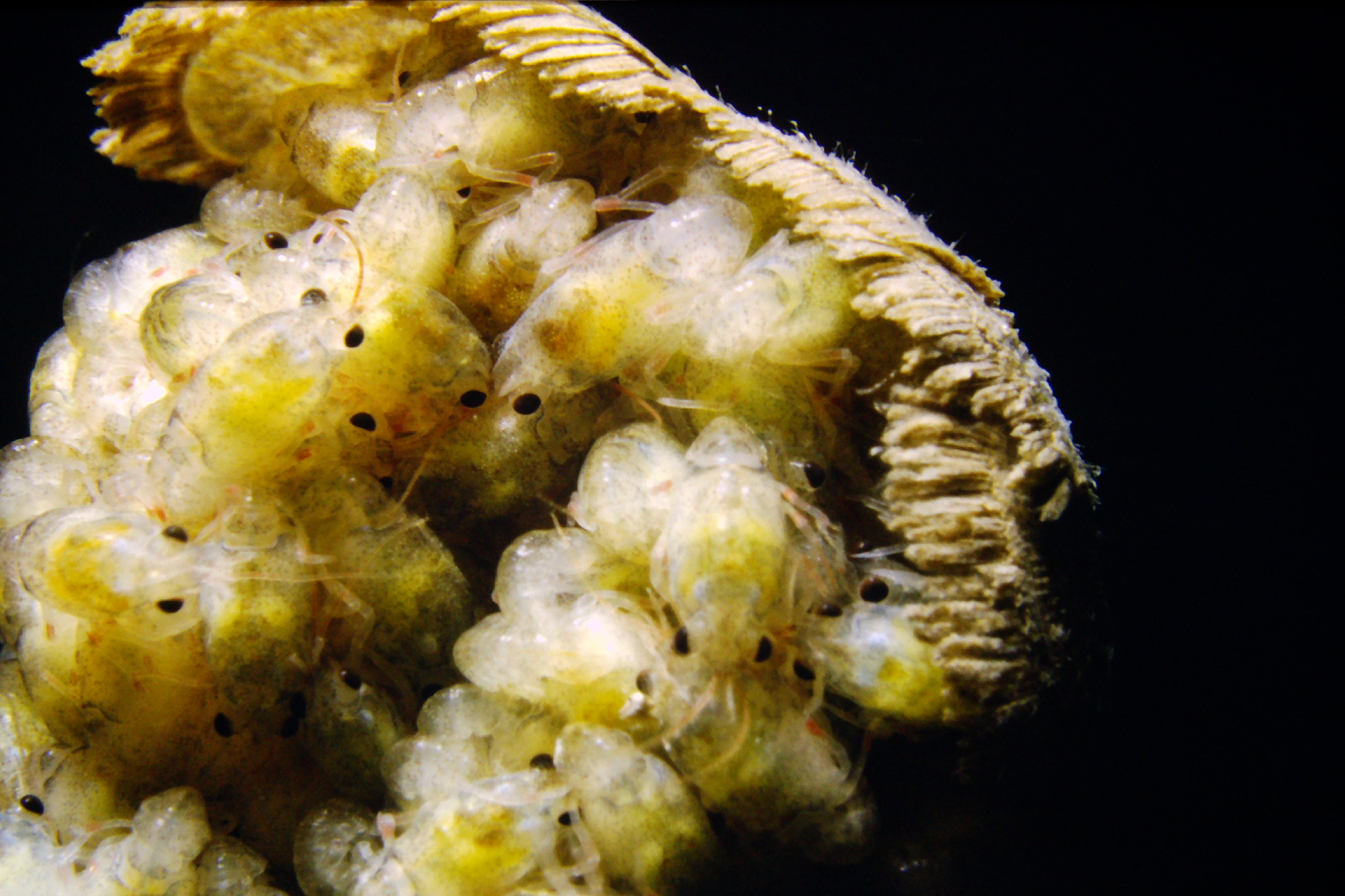 The eggs hatch as identical, transparent versions of the adults. But so tiny they could stand on the head of a pin. The minuscule larvae continue to hide under their mom’s tail for a couple more of weeks.