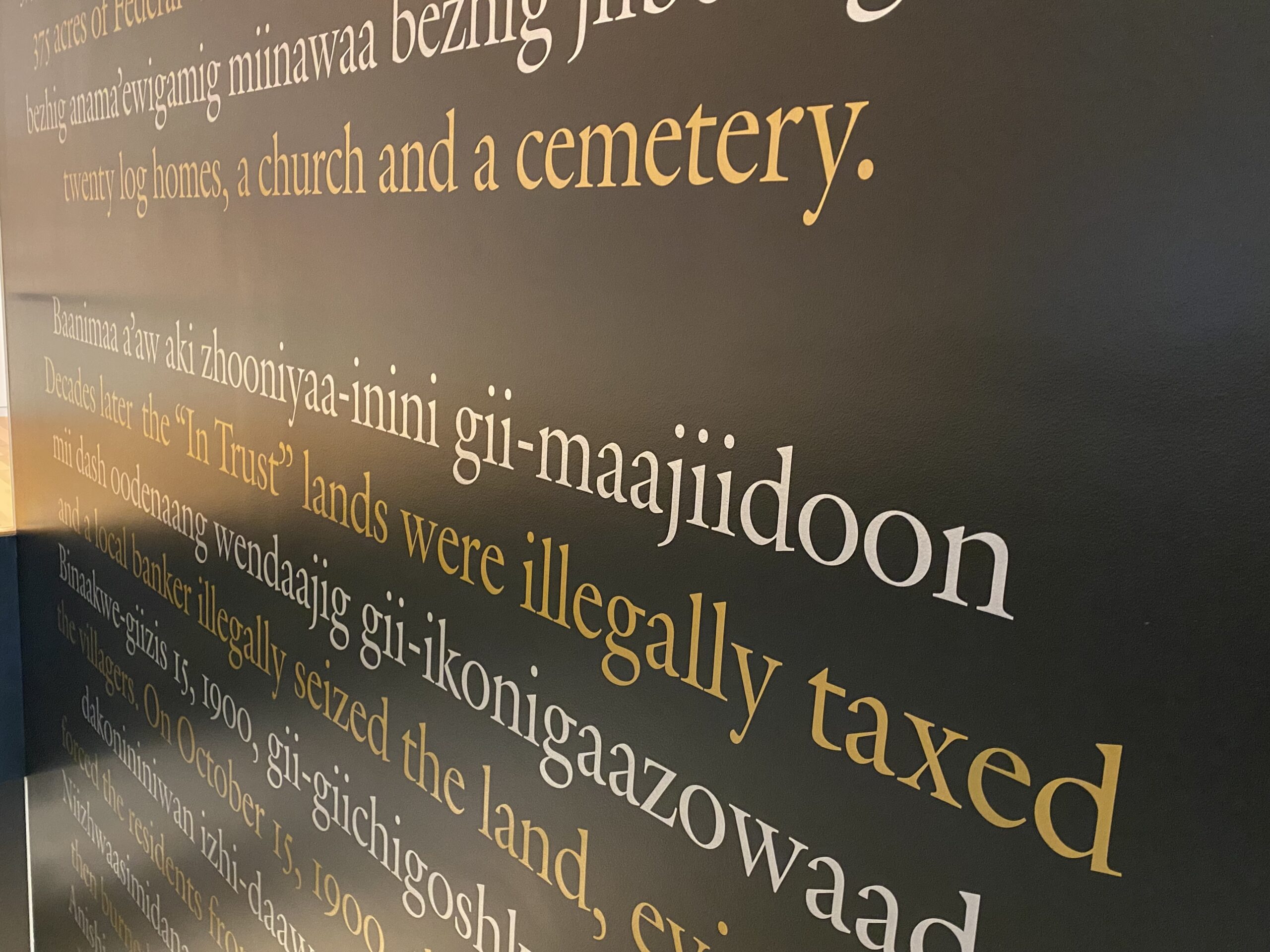 Between Burt Lake and Douglas Lake there are hundreds of small shallow pits that were used to store goods. Scientists have done some infrared imaging of the land that has produced some detailed maps that document these caches all over the area. When coming up with both the title and guiding metaphor for the exhibition, I was thinking of the things we do today to set ourselves up for the future, and for survival. These caches are how the ancestors insulated and insured their future, but what are we doing now to insure our futures as a people? I also wanted to move beyond the Burnout history. One of the images in the exhibition states, “Oct. 15, 1900 is not the end,” meaning that the land can be returned, the people can come home because the end has not been written.