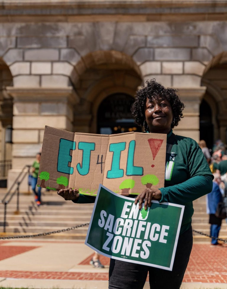 Featured image: A member of the Southeast Environmental Task Force protests sacrifice zones, Black and Hispanic communities that are targeted for polluting industries. Image: Southeast Environmental Task Force’s Instagram.