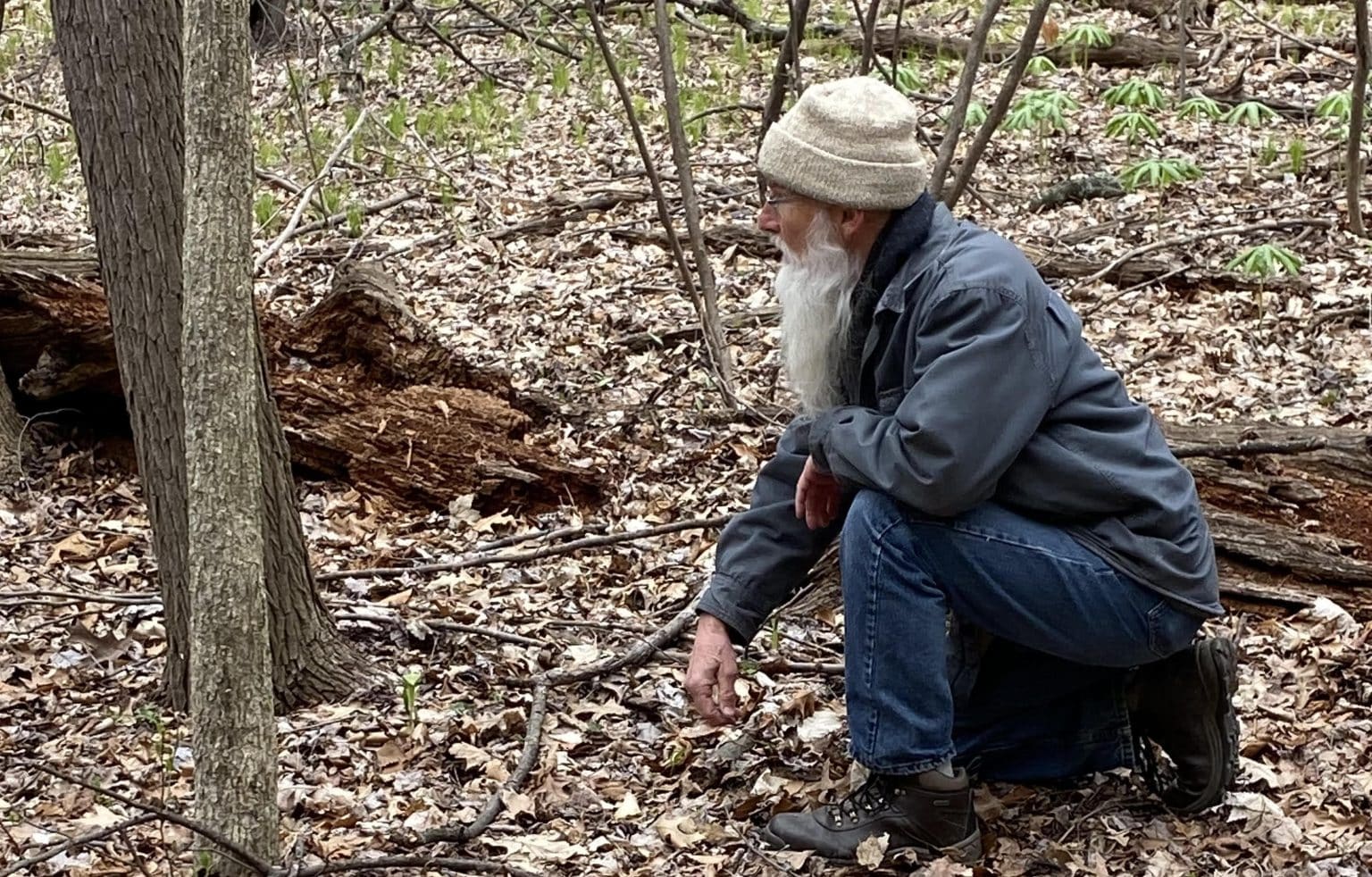 Featured image: Bill Craig kneels next to a jack-in-the-pulpit flower near the Rouge River. Photo by Zach Lassen.