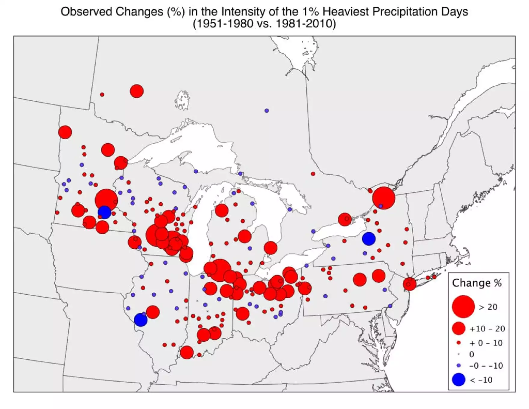 Long-term data analyzed by the Great Lakes Integrated Sciences and Assessments shows that the heaviest storms now bring 25 percent more rain than they did before 1980. And those heavy storms are happening 24 percent more frequently.
