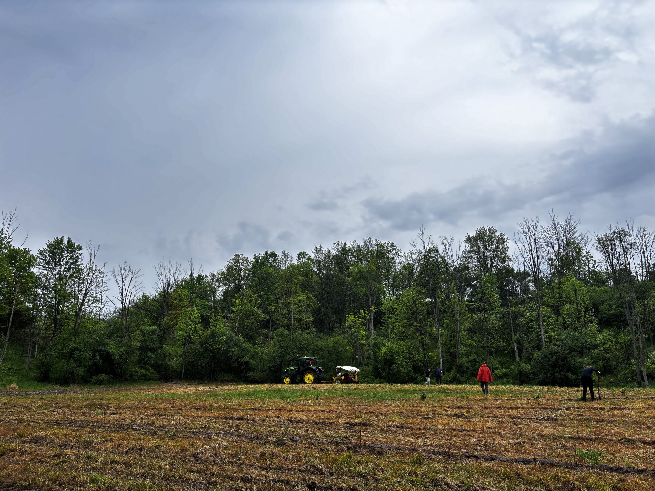 Once Blain had given the greenlight to begin the day’s planting, a growing team of LTVCA staff and others from ALUS Middlesex set to work. The rain had lightened to a steady drizzle. While the rain made for a soggy morning of planting, the fact that the ground was still solid enough to use the tractor meant that Blain and the crew could avoid planting hundreds of trees by hand.
