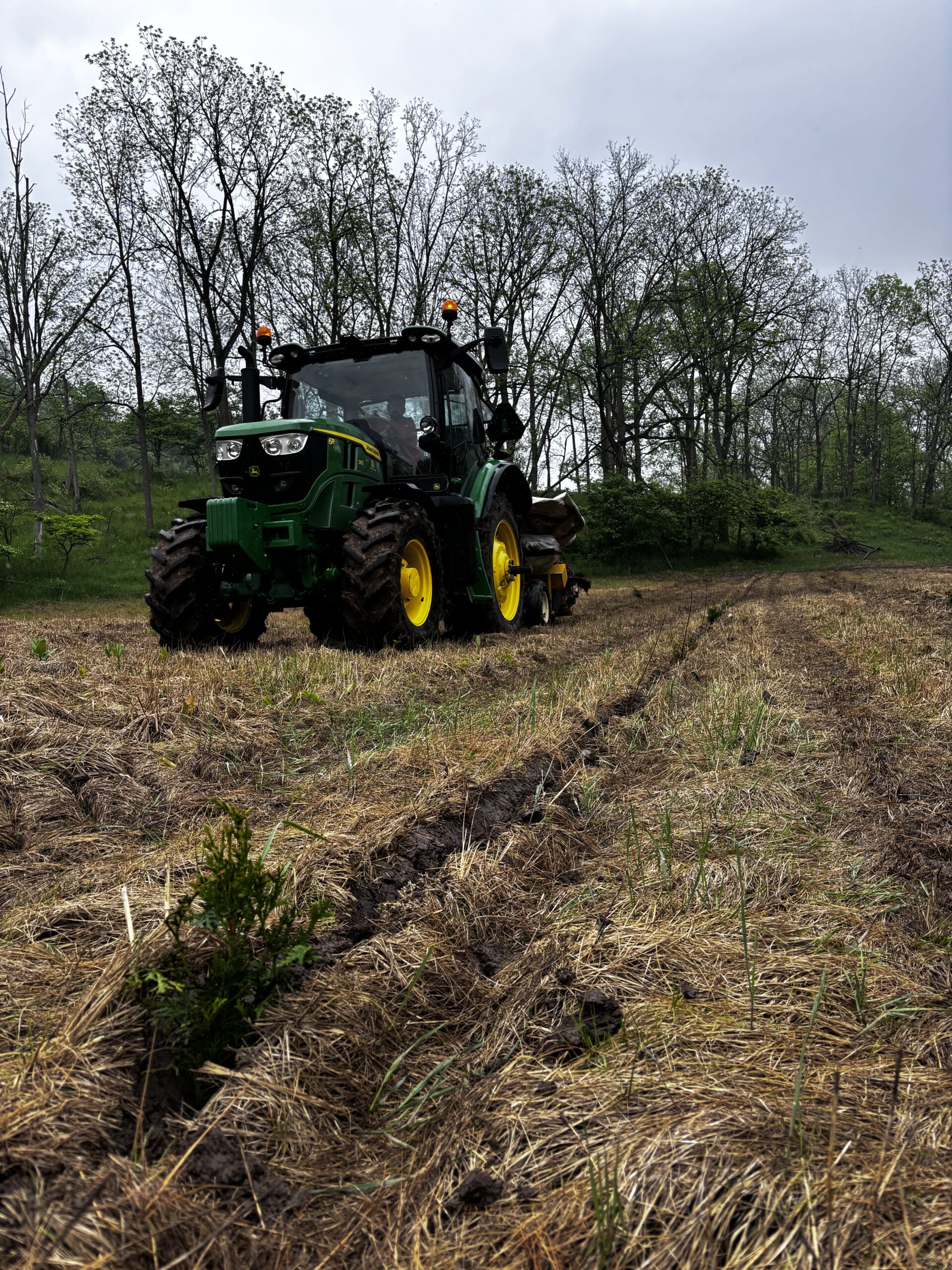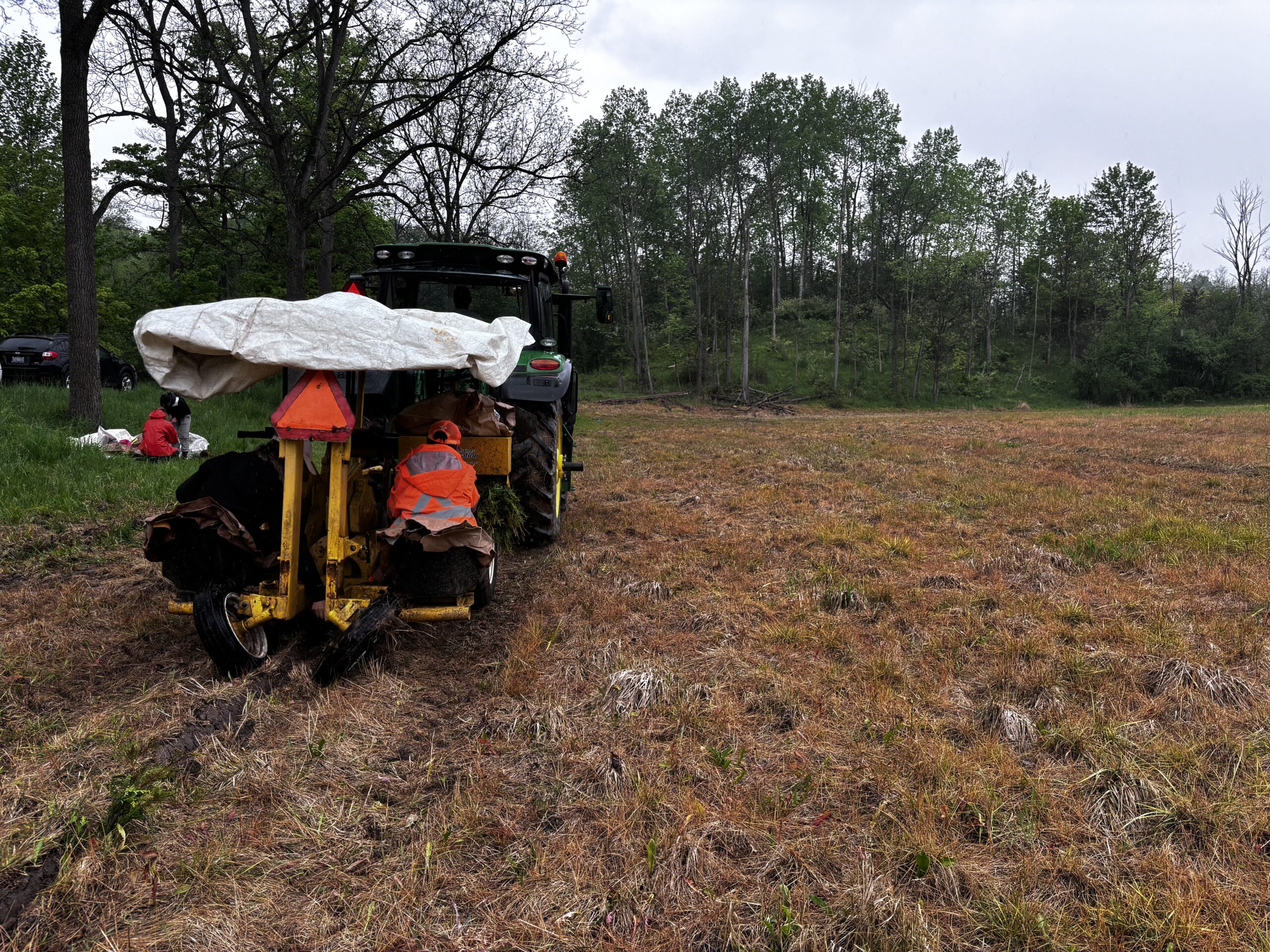 Young fired up the tractor. Behind him in the trailer sat two staff members beneath a sagging green tarp laid atop the trailer in a noble but fruitless attempt to shield them from the rain. In front of each staffer sat a stuffed sack, filled with saplings — nannyberry and white cedar, but also tamarack, silver maple, red osier dogwood, and black oak. Between them sat a lever that lowers a heavy blade. It’s capable of slicing a gash in the soil wide enough for each staffer to pull a sapling from their lap and then dropping a tree into the dirt every eight feet. Small tires at the back of the trailer angled inwards pinch the freshly cut seam shut.