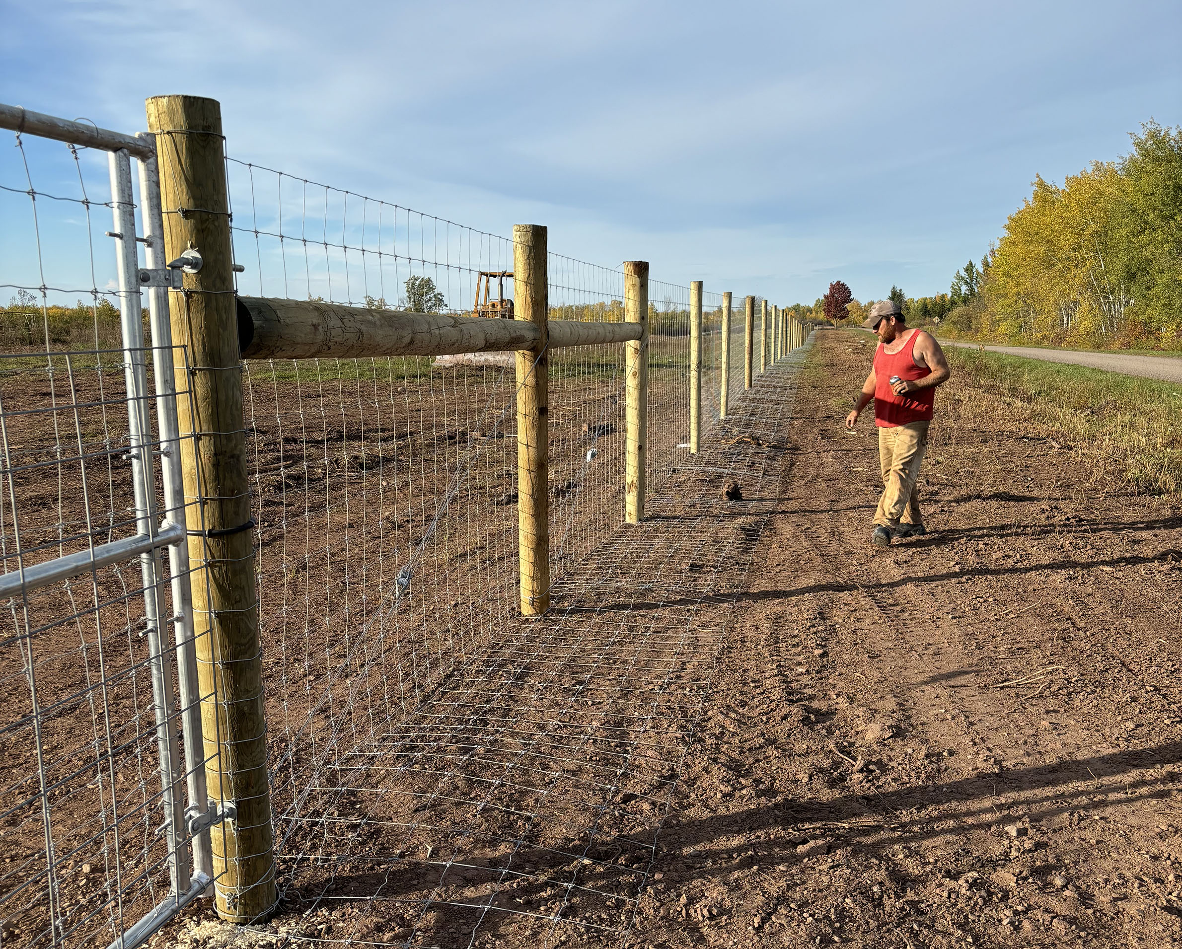 U.S. Department of Agriculture Wildlife Services worked with the Wisconsin Department of Natural Resources to install the fence on 35 acres of the Soyring farm last fall, and they’ve been adding another fence on 80 acres this month. The net wire fences are 74 inches high and use a 42-inch wire apron that lays flat on the ground at the bottom of the fence.