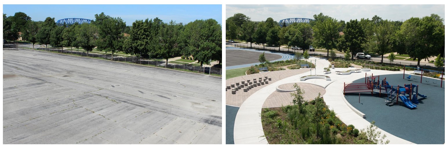 One green infrastructure initiative of the MWRD is Space to Grow, which transforms asphalt lots into green schoolyards that store water in the soil beneath the surface. This partnership with Chicago Public Schools (CPS), the Chicago Department of Water Management (CDWM), Healthy Schools Campaign (HSC) and Openlands seeks multiple solutions to the increasing amount of precipitation.