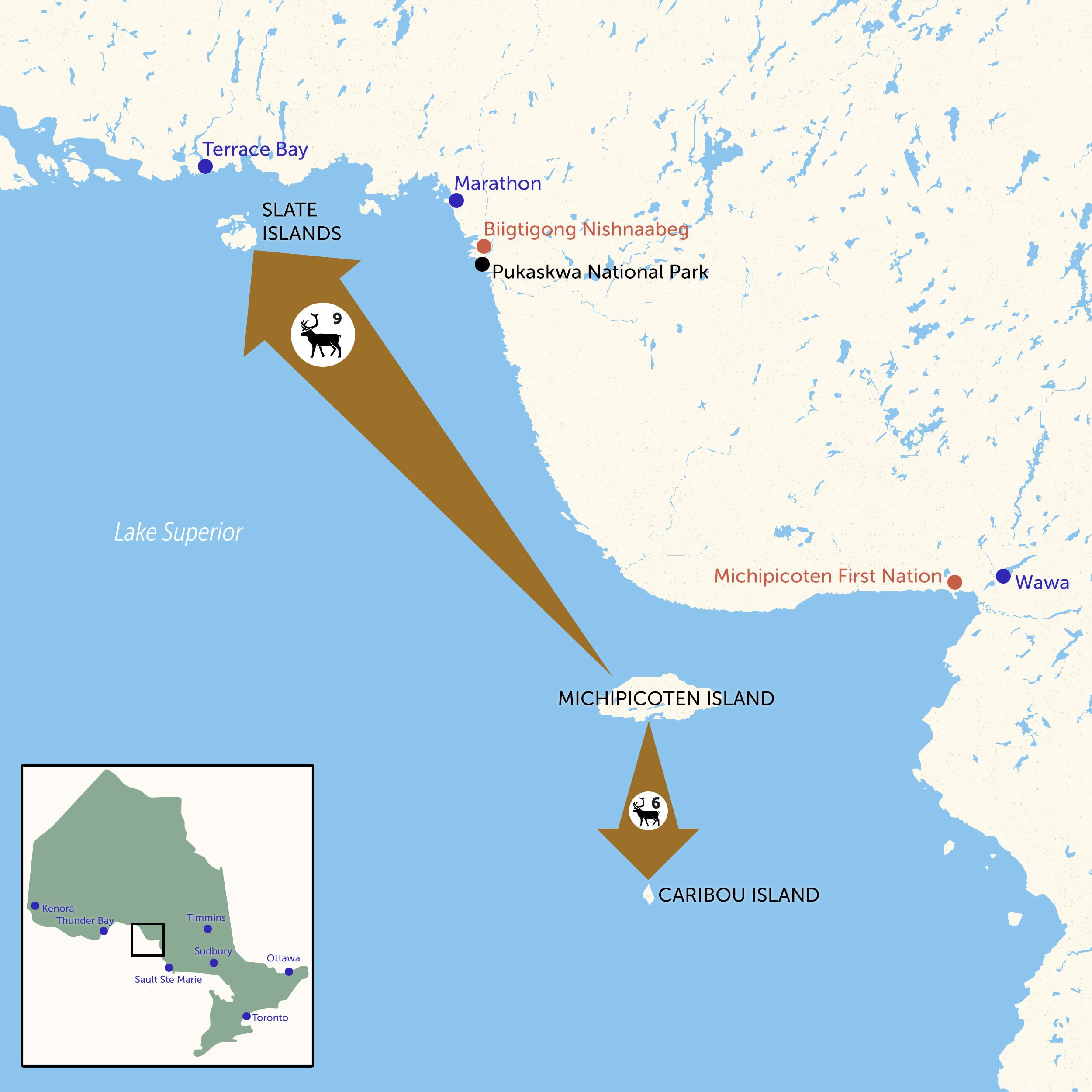 Years went by, and the Ontario government studied the situation but didn’t do anything about it, even as Biigtigong Nishnaabeg, Michipicoten First Nation and other locals called on them to act. In early 2018, two bulls were the only caribou left on the Slate Islands, alive but unable to reproduce. About 15 more caribou remained on Michipicoten Island.