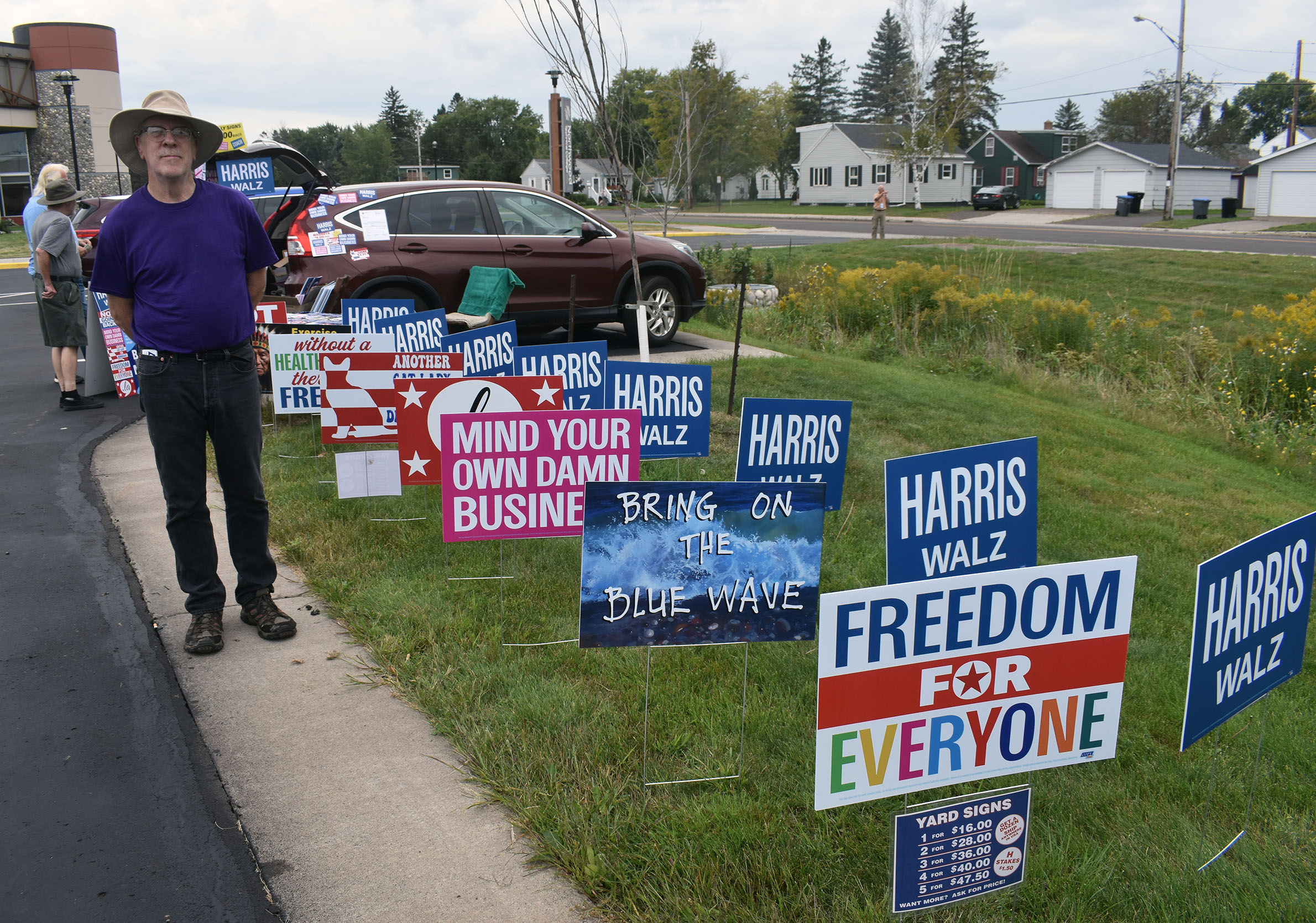 Outside a September rally with Minnesota Gov. Tim Walz at the University of Wisconsin-Superior, Ashland business owner and Democrat Will Pipkin set up signs with a cavalcade of slogans, including “Another cat lady for democracy” and “Without a healthy climate, there’s no freedom.”