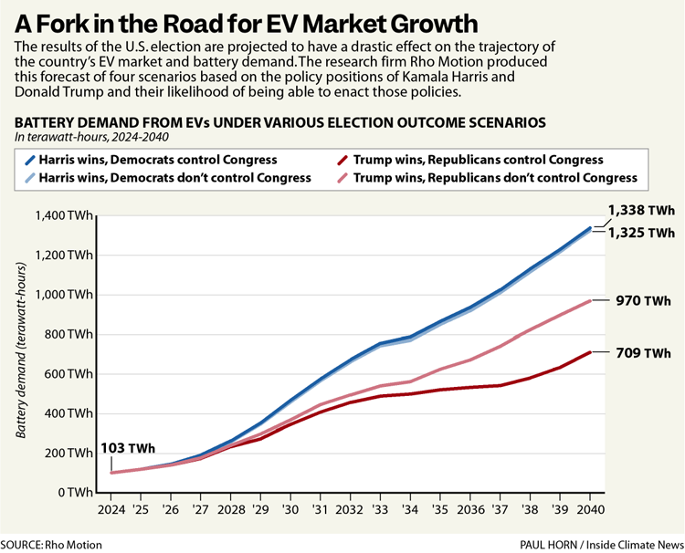 If Trump wins and Republicans control Congress, the result would be EV battery demand in 2040 that is more than 40 percent lower than the scenarios in which Harris wins, according to Rho Motion’s projection.