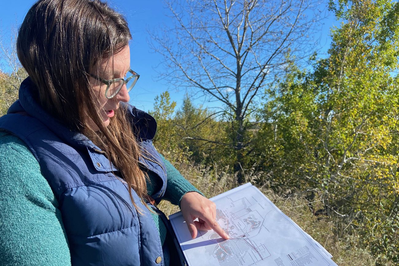 Featured image: Elise Matz of Circle Power Renewables studies a map showing the layout of a proposed 120-megawatt solar project that would occupy part of the former Groveland Mine site in Dickinson County. (Bridge photo by Kelly House)
