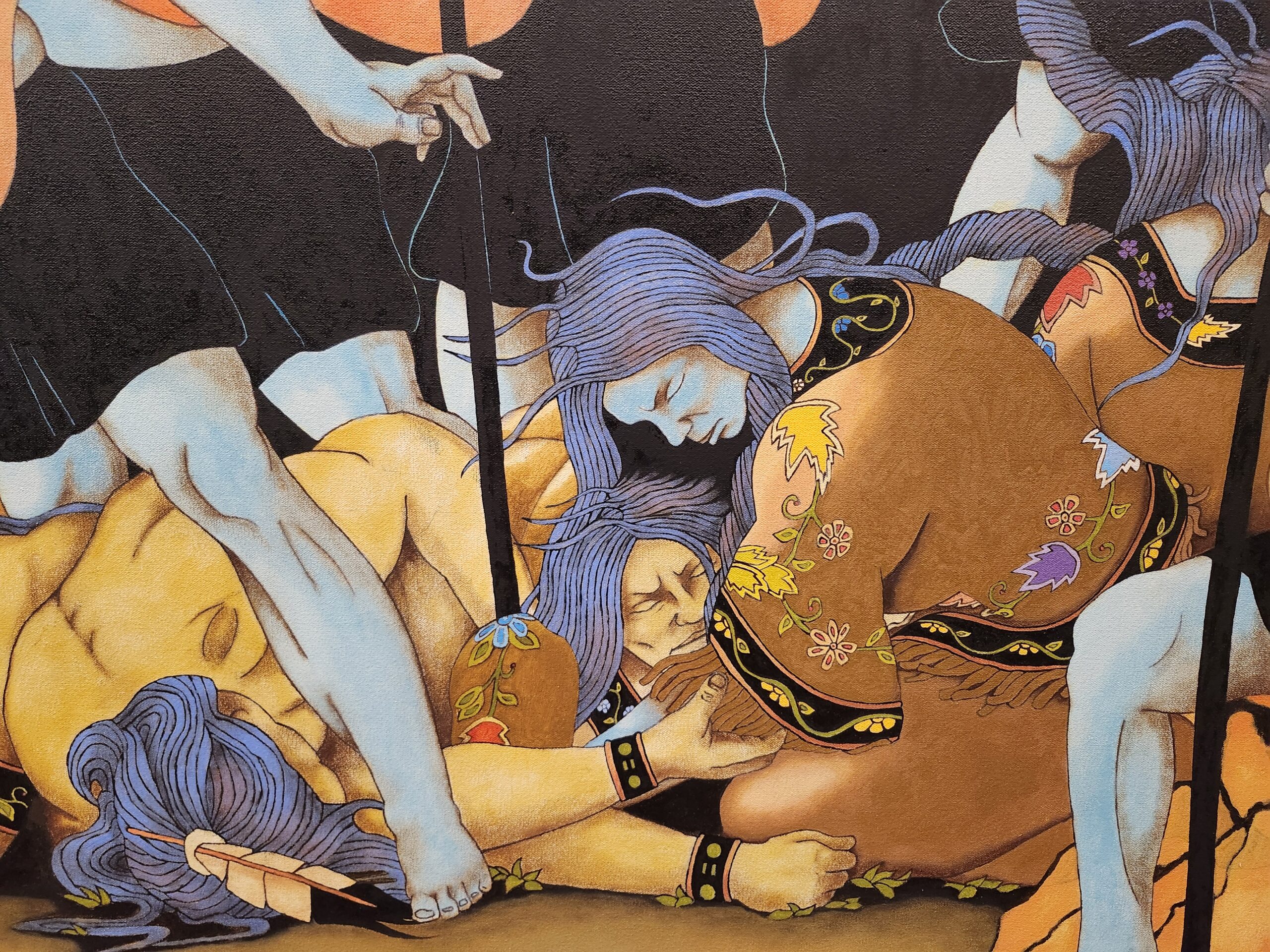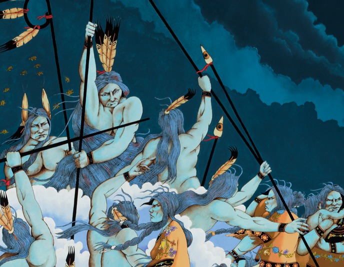 And Strickland digs deeper and goes much further than other artists. Amidst the attack, survivors attempt to leave or escape off the edge of the world, moving toward an army of warrior spirits who emerge amidst a bank of clouds. Among them is Nanabozho, who often appears in Strickland’s paintings with the legs and ears of a rabbit — one of Nanabozho’s magical embodiments and spiritual gifts. The arrival of the warrior spirits helps us see that the red-haired usurpers are not just soldiers, but are the intentional conquistadors who impose starvation, cultural destruction, the loss of homelands, assimilation and Christianity on the people.
