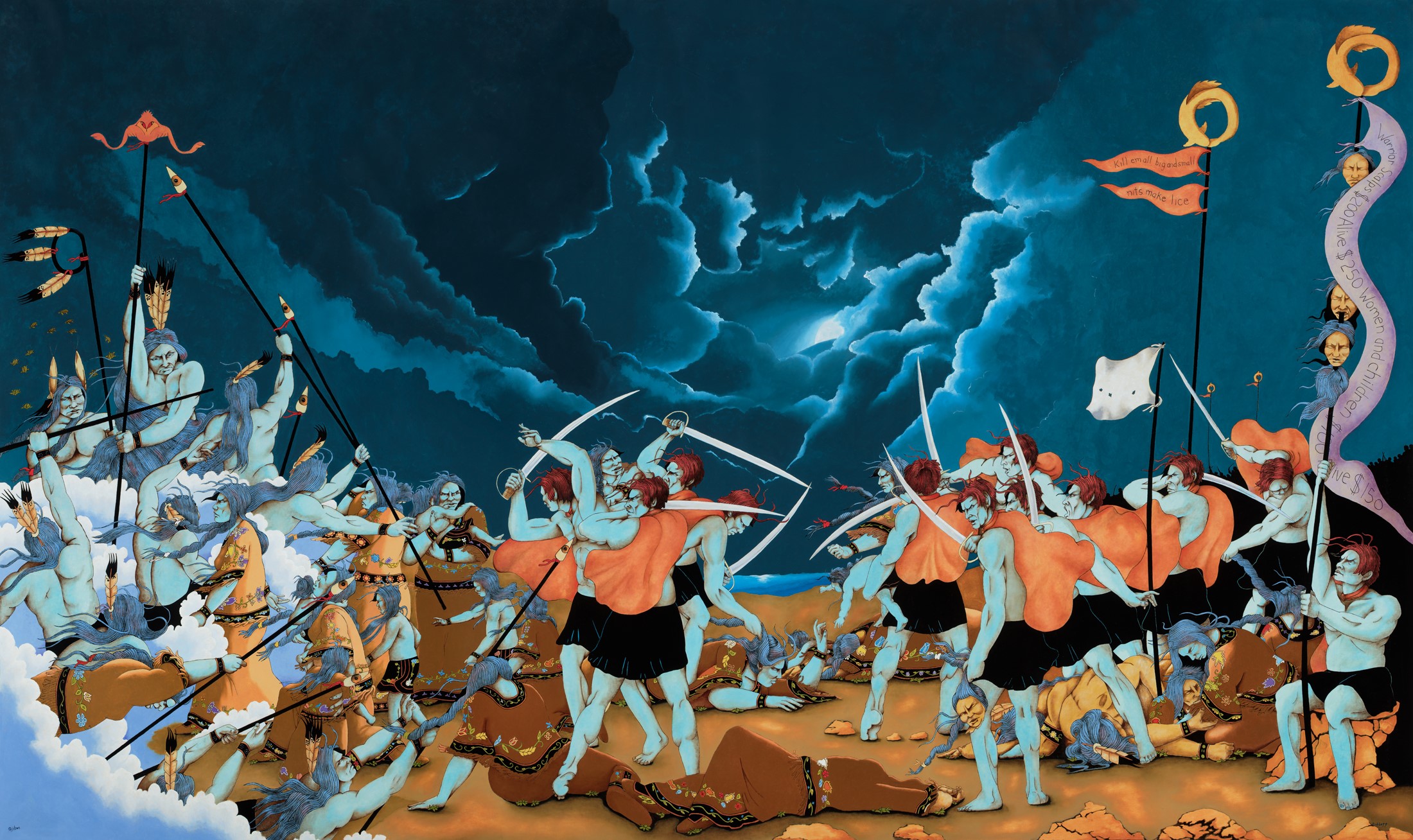 The visitor is pulled into a great tragedy unfolding in front of dark, ominous skies. Tenderly painted Ojibwe children, women and men are under attack, some trampled by a red-headed army of usurpers with swords, young and old kneeling next to the dying, in grief and agony. In the foreground a woman has been decapitated, a usurper dangling her head above her lifeless body by the hair. One of the swordsmen holds a banner which lists bounties for “warrior scalps $200; alive $250; women and children $100; alive $150.” On another banner are the phrases “kill ‘em all, big and small,” and “nits make lice,” direct quotes from a man named John Chivington, a Methodist pastor who also served as a colonel in the Civil War.
