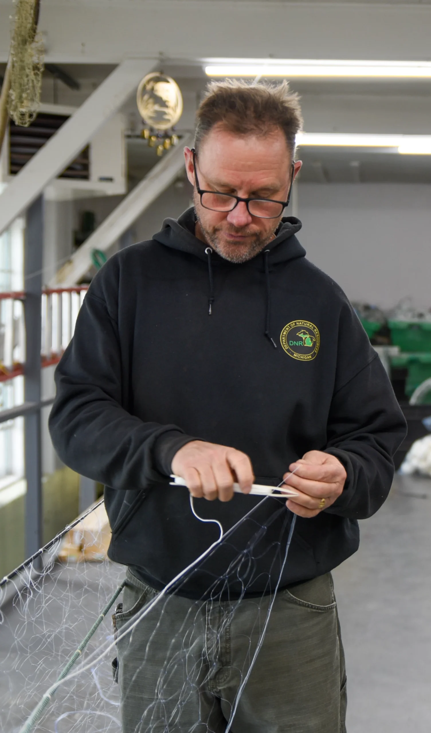 Back at the Charlevoix Fisheries Research Station, vessel captain Patrick O’Neill is repairing nets that are used to take samples during the warm water season.