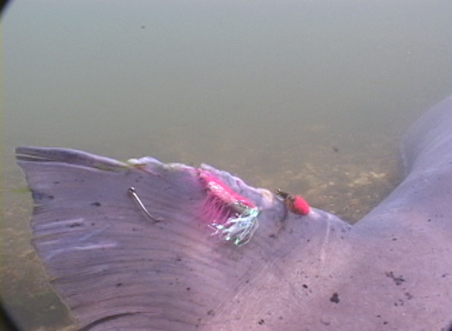 The first adult Greg filmed had multiple lures embedded in its dorsal fin and fresh gashes scarred its back.