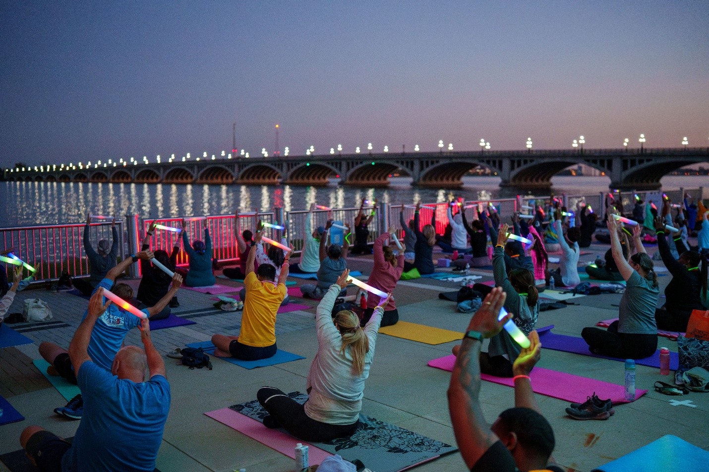 Moonlight yoga on the Detroit Riverwalk. (Photo Credit: Nadir Ali)