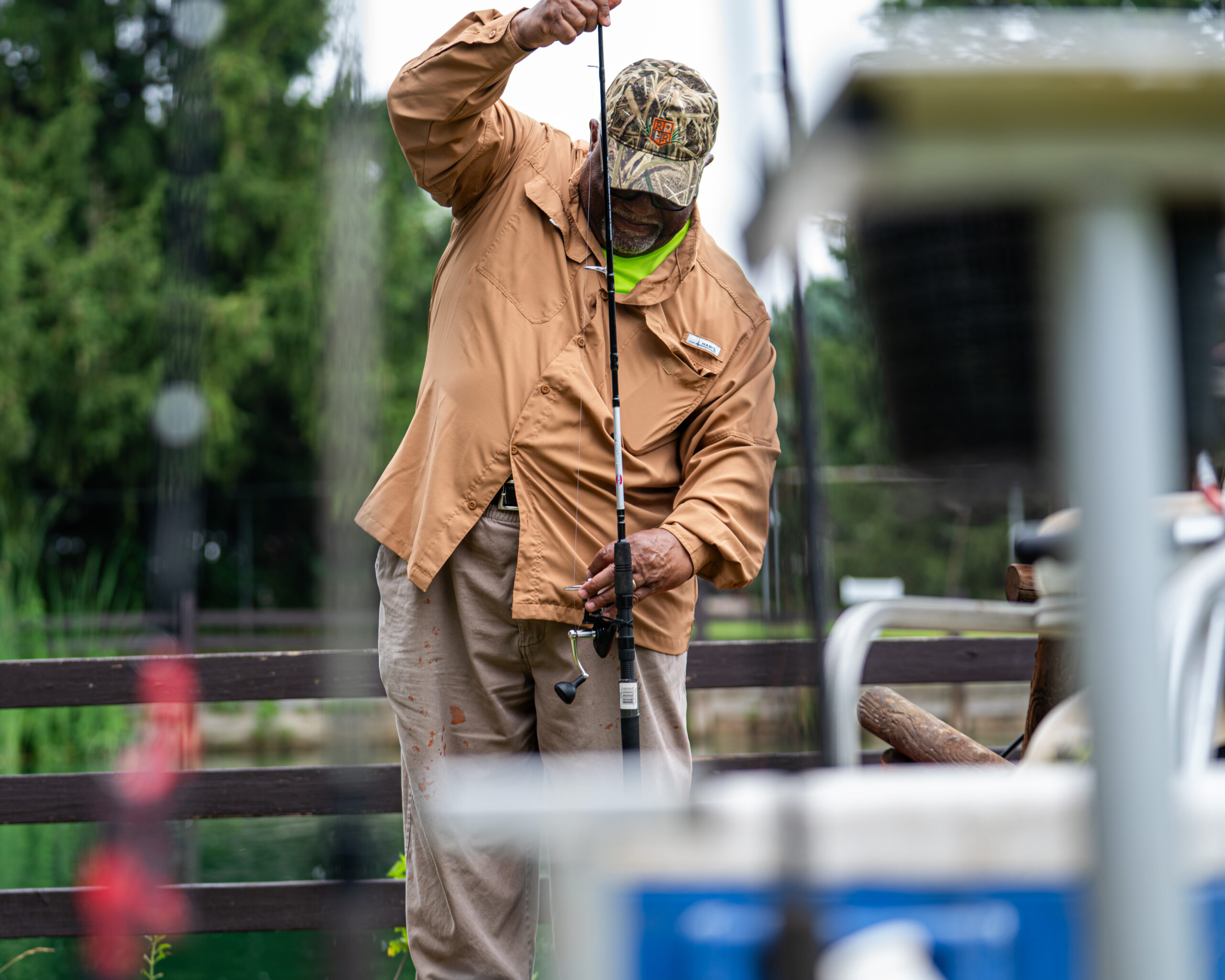 A fisher prepares his poles near the catfish pond at Spring Valley Trout Farm in Dexter, Michigan on June 26, 2025. (Photo Credit: Donté Smith/Great Lakes Now)